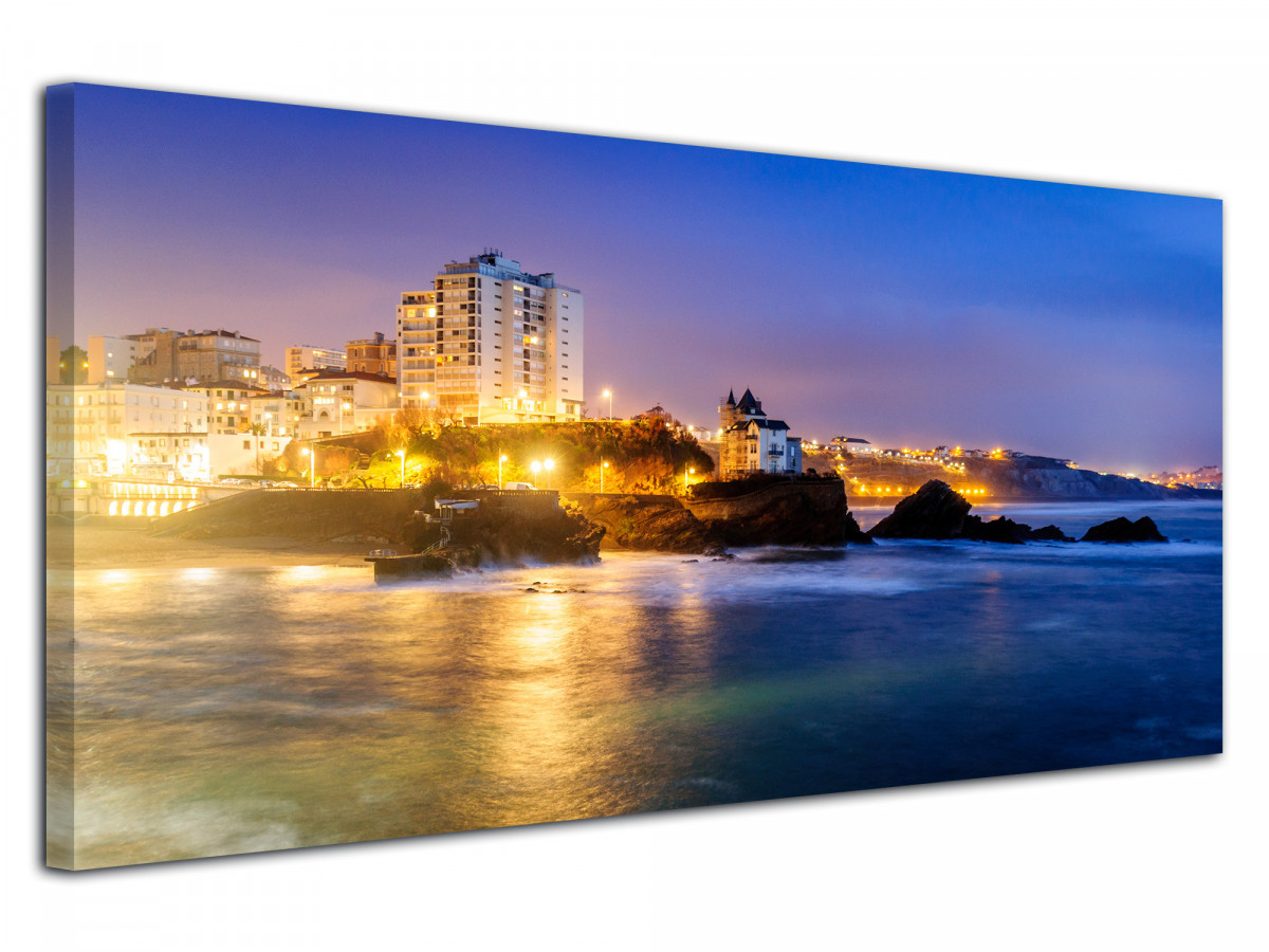 Cap sur Biarritz, ville balnéaire, ces rochers, cette vu nocturne, vous pouvez apercevoir sur le fond la fameuse villa Belza tant convoitée, ce paysage au soleil couchant, fait littéralement rêver. N'hésitez plus, ce tableau photo paysage sur toile imprimée sera parfait pour accompagner la décoration de votre salon ou chambre à coucher.