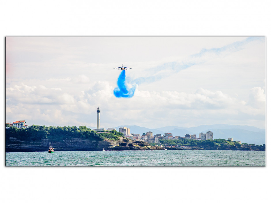 La patrouille de France s'est invitée dans une des plus belles villes qui est Biarritz, océan calme, vu sur les rochers sur ces habitations et sur l'incontournable phare plein de charme qui nous éblouis et indique la direction des bateaux pour rentrer à bon port. Ce tableau photo paysage sera parfait pour décorer votre intérieur ou pour offrir. Laissez vous tenter !