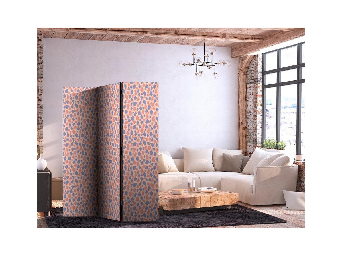 Les paravents décoratifs sont certainement une idée originale dans le domaine de la décoration intérieure. Les paravents remplissent un rôle décoratif, mais aussi bien pratique et fonctionnel. En effet, un paravent intérieur "Paravent - Giraffe Pattern - Colorful Animal Pattern in Blue-Pink Spots" est un meuble formant une cloison amovible et repliable qui peut servir pour délimiter un espace et diviser une grande pièce en deux espaces séparés. Le paravent intérieur est une invention qui est apparue pour la première fois en Chine. Depuis le début de leur existence, les paravents remplissaient des différentes fonctions, comme protéger contre les courants d'air ou bien encore créer un espace isolé pour l'intimité. De nos jours, le paravent intérieur est une belle décoration intérieure, qui permet aussi de gérer l'espace d’une ou de plusieurs pièces selon notre volonté. Le paravent intérieur est également utilisé dans les locaux de service, comme un coiffeur, un cabinet médical ou un bureau comptable pour créer un espace propice à l’intimité ou bien encore à la concentration.
