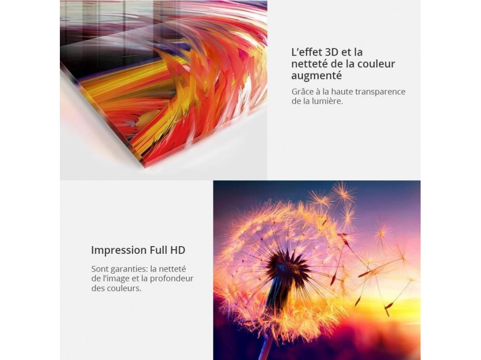 Les tableaux sur verre gardent seulement les avantages d’une impression classique sur verre — le poids et la fragilité sont proscrits. Ils sont réalisés en matériel apprécié dans l’architecture d’intérieure le Polyméthacrylate de méthyle. Le poly connu sous le nom de « verre acrylique » ou « Plexiglas », est comme le verre classique il est incolore et rigide. À l’instar du verre il ne déteint pas sous l’expositions aux rayons UV et est caractérisé par une haute (plus de 90%) perméabilité de la lumière. Contrairement au verre classique il est deux fois moins lourd et définitivement plus résistant. Le verre acrylique est plus élastique il est donc plus difficile de le briser. En ce qui concerne les tableaux en verre, l’impression y est placé sous forme de contrecollage en film. Cette technique assure une netteté de l’image et des couleurs et une saturation des couleurs. Le tableau sur Plexiglas garanti une profondeur 3D et une légère brillance. L’impression sur verre acrylique est la meilleure option pour les personnes aimant les solutions pratiques.