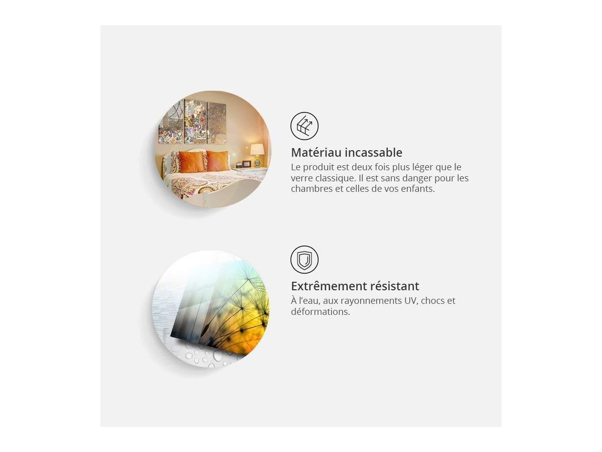 Les tableaux sur verre gardent seulement les avantages d’une impression classique sur verre — le poids et la fragilité sont proscrits. Ils sont réalisés en matériel apprécié dans l’architecture d’intérieure le Polyméthacrylate de méthyle. Le poly connu sous le nom de « verre acrylique » ou « Plexiglas », est comme le verre classique il est incolore et rigide. À l’instar du verre il ne déteint pas sous l’expositions aux rayons UV et est caractérisé par une haute (plus de 90%) perméabilité de la lumière. Contrairement au verre classique il est deux fois moins lourd et définitivement plus résistant. Le verre acrylique est plus élastique il est donc plus difficile de le briser. En ce qui concerne les tableaux en verre, l’impression y est placé sous forme de contrecollage en film. Cette technique assure une netteté de l’image et des couleurs et une saturation des couleurs. Le tableau sur Plexiglas garanti une profondeur 3D et une légère brillance. L’impression sur verre acrylique est la meilleure option pour les personnes aimant les solutions pratiques.