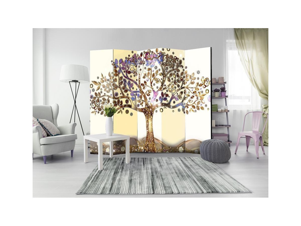 Un paravent décoratif "Paravent - Golden Tree II" est composé de panneaux orientables, appelés volets, en bois encadrés d'un châssis de bois et réunis par des charnières. Le paravent décoratif disponible dans notre offre se compose de trois ou de cinq parties. Tous les paravents que nous proposons ont une impression de haute qualité sur l’entoilage qui peut être une belle décoration d'intérieur. L'entoilage d’un paravent déco est tendu sur un cadre en bois solide et léger en même temps. Les panneaux sont finis avec un ruban de satin. Les charnières métalliques sont durables et très solides.Caractéristique technique