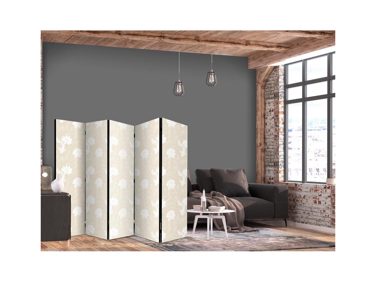 Un paravent décoratif "Paravent - Fish and Water Lilies - Bright Oriental Fish Swimming Among Water Flowers on a Delicate Sand-Beige Background" est composé de panneaux orientables, appelés volets, en bois encadrés d'un châssis de bois et réunis par des charnières. Le paravent décoratif disponible dans notre offre se compose de trois ou de cinq parties. Tous les paravents que nous proposons ont une impression de haute qualité sur l’entoilage qui peut être une belle décoration d'intérieur. L'entoilage d’un paravent déco est tendu sur un cadre en bois solide et léger en même temps. Les panneaux sont finis avec un ruban de satin. Les charnières métalliques sont durables et très solides.Caractéristique technique