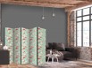 Un paravent décoratif "Paravent - Fish And Japanese Pattern - Koi Fish in Orange-Cream Colors on a Green-Mint Background With An Oriental Pattern" est composé de panneaux orientables, appelés volets, en bois encadrés d'un châssis de bois et réunis par des charnières. Le paravent décoratif disponible dans notre offre se compose de trois ou de cinq parties. Tous les paravents que nous proposons ont une impression de haute qualité sur l’entoilage qui peut être une belle décoration d'intérieur. L'entoilage d’un paravent déco est tendu sur un cadre en bois solide et léger en même temps. Les panneaux sont finis avec un ruban de satin. Les charnières métalliques sont durables et très solides.Caractéristique technique