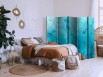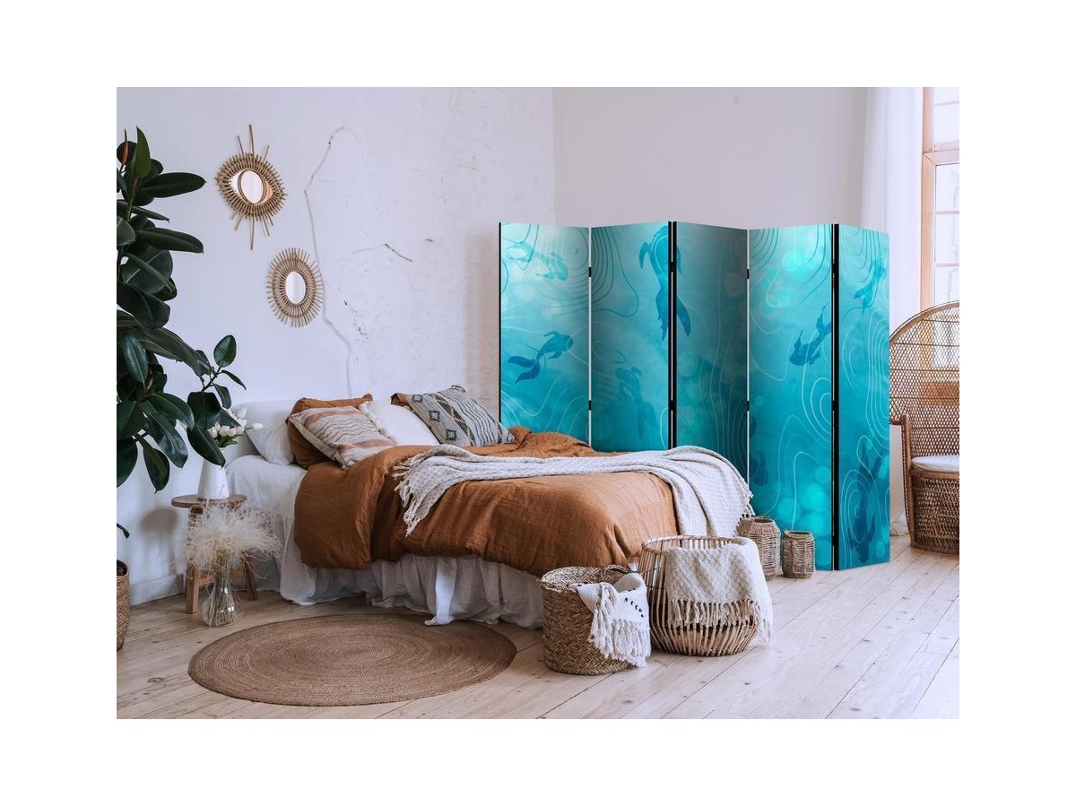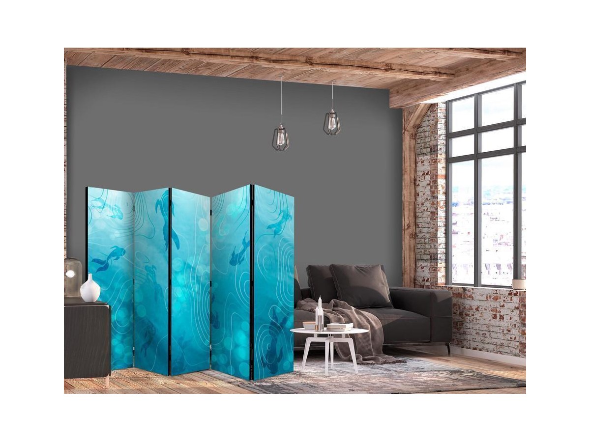 Les paravents décoratifs sont certainement une idée originale dans le domaine de la décoration intérieure. Les paravents remplissent un rôle décoratif, mais aussi bien pratique et fonctionnel. En effet, un paravent intérieur "Paravent - Koi Fish Beneath the Water Surface - A Cluster of Japanese Fish in the Depths of the Pond in Shades of Navy and Blue" est un meuble formant une cloison amovible et repliable qui peut servir pour délimiter un espace et diviser une grande pièce en deux espaces séparés. Le paravent intérieur est une invention qui est apparue pour la première fois en Chine. Depuis le début de leur existence, les paravents remplissaient des différentes fonctions, comme protéger contre les courants d'air ou bien encore créer un espace isolé pour l'intimité. De nos jours, le paravent intérieur est une belle décoration intérieure, qui permet aussi de gérer l'espace d’une ou de plusieurs pièces selon notre volonté. Le paravent intérieur est également utilisé dans les locaux de service, comme un coiffeur, un cabinet médical ou un bureau comptable pour créer un espace propice à l’intimité ou bien encore à la concentration.