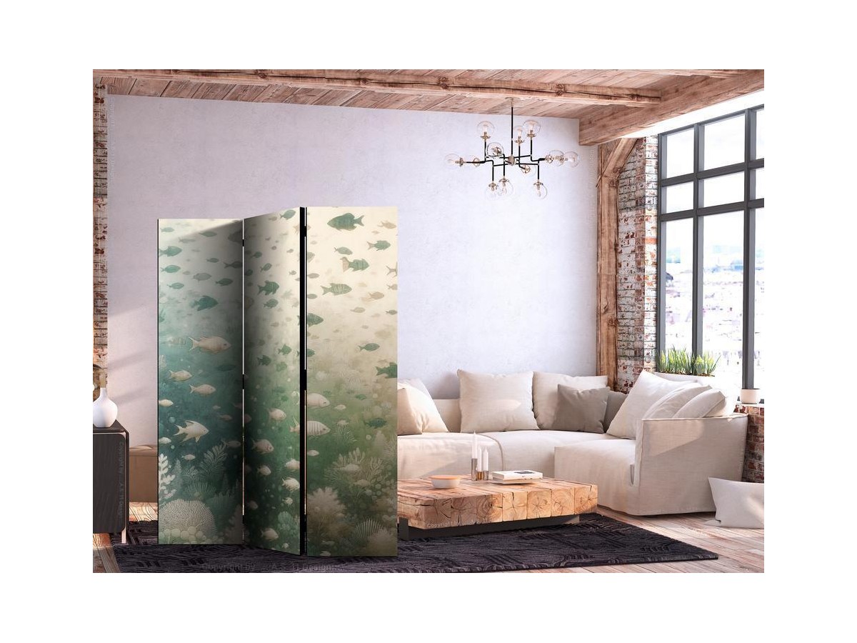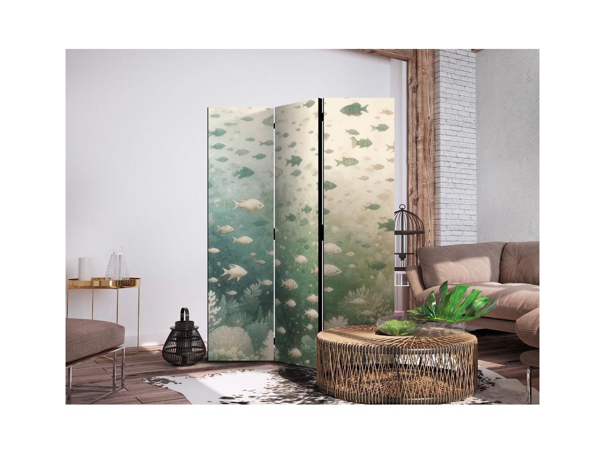 Les paravents décoratifs sont certainement une idée originale dans le domaine de la décoration intérieure. Les paravents remplissent un rôle décoratif, mais aussi bien pratique et fonctionnel. En effet, un paravent intérieur "Paravent - Fish and Diverse Vegetation - A Group of Fish in Pastel Muted Colors Among Oceanic Vegetation" est un meuble formant une cloison amovible et repliable qui peut servir pour délimiter un espace et diviser une grande pièce en deux espaces séparés. Le paravent intérieur est une invention qui est apparue pour la première fois en Chine. Depuis le début de leur existence, les paravents remplissaient des différentes fonctions, comme protéger contre les courants d'air ou bien encore créer un espace isolé pour l'intimité. De nos jours, le paravent intérieur est une belle décoration intérieure, qui permet aussi de gérer l'espace d’une ou de plusieurs pièces selon notre volonté. Le paravent intérieur est également utilisé dans les locaux de service, comme un coiffeur, un cabinet médical ou un bureau comptable pour créer un espace propice à l’intimité ou bien encore à la concentration.