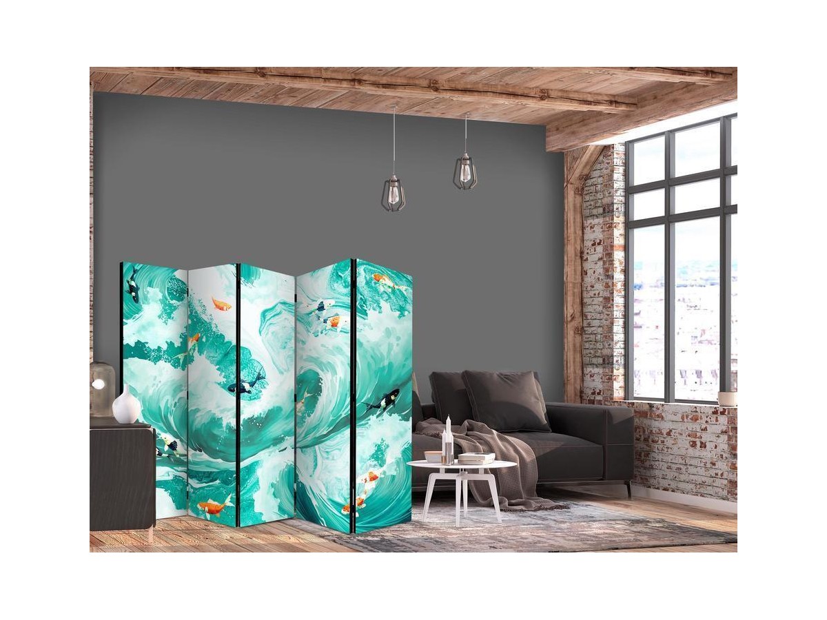 Les paravents décoratifs sont certainement une idée originale dans le domaine de la décoration intérieure. Les paravents remplissent un rôle décoratif, mais aussi bien pratique et fonctionnel. En effet, un paravent intérieur "Paravent - Koi Fish Among Waves - Japanese Fish Amid Waves in Shades of Turquoise And White" est un meuble formant une cloison amovible et repliable qui peut servir pour délimiter un espace et diviser une grande pièce en deux espaces séparés. Le paravent intérieur est une invention qui est apparue pour la première fois en Chine. Depuis le début de leur existence, les paravents remplissaient des différentes fonctions, comme protéger contre les courants d'air ou bien encore créer un espace isolé pour l'intimité. De nos jours, le paravent intérieur est une belle décoration intérieure, qui permet aussi de gérer l'espace d’une ou de plusieurs pièces selon notre volonté. Le paravent intérieur est également utilisé dans les locaux de service, comme un coiffeur, un cabinet médical ou un bureau comptable pour créer un espace propice à l’intimité ou bien encore à la concentration.