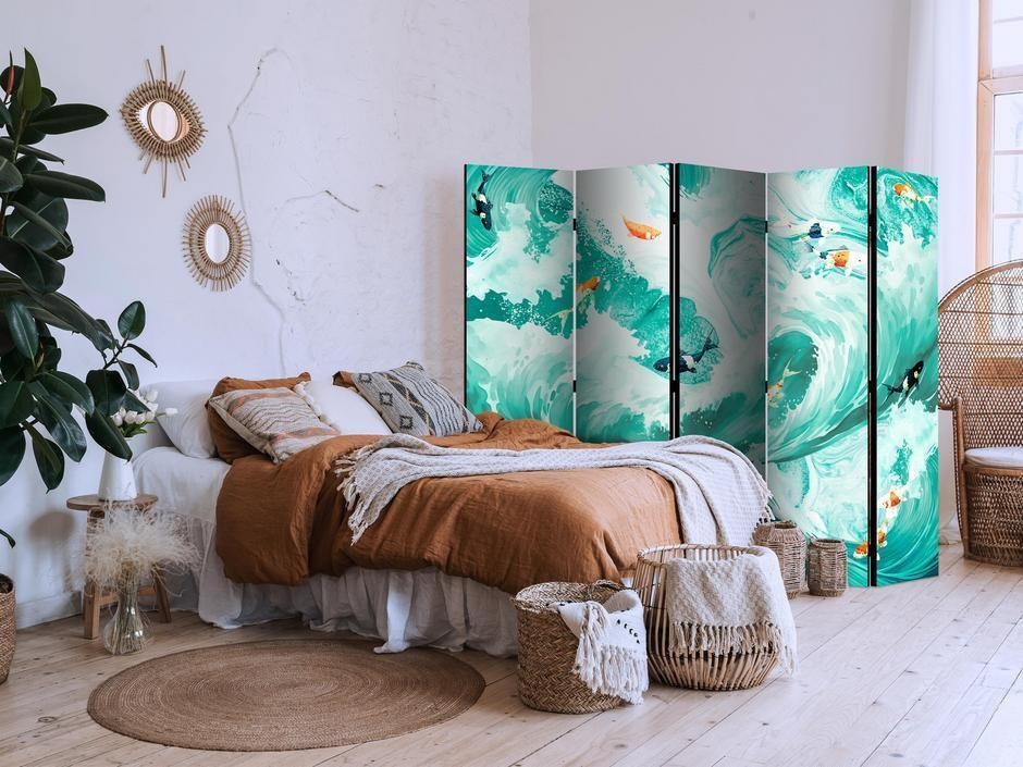 Paravent intérieur "Paravent - Koi Fish Among Waves - Japanese Fish Amid Waves in Shades of Turquoise And White"