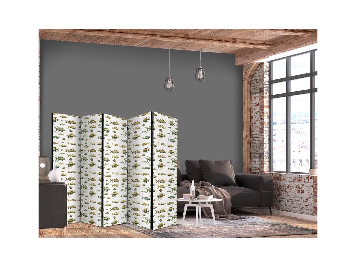 Les paravents décoratifs sont certainement une idée originale dans le domaine de la décoration intérieure. Les paravents remplissent un rôle décoratif, mais aussi bien pratique et fonctionnel. En effet, un paravent intérieur "Paravent - Unusual Species of Fish - a Cluster of Fish in Muted Colors in Retro Style Against a Background of Beige Streaks" est un meuble formant une cloison amovible et repliable qui peut servir pour délimiter un espace et diviser une grande pièce en deux espaces séparés. Le paravent intérieur est une invention qui est apparue pour la première fois en Chine. Depuis le début de leur existence, les paravents remplissaient des différentes fonctions, comme protéger contre les courants d'air ou bien encore créer un espace isolé pour l'intimité. De nos jours, le paravent intérieur est une belle décoration intérieure, qui permet aussi de gérer l'espace d’une ou de plusieurs pièces selon notre volonté. Le paravent intérieur est également utilisé dans les locaux de service, comme un coiffeur, un cabinet médical ou un bureau comptable pour créer un espace propice à l’intimité ou bien encore à la concentration.