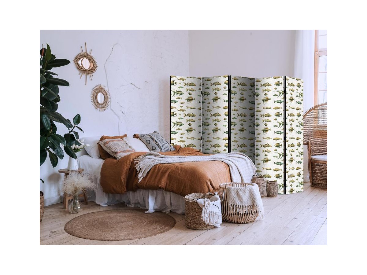 Un paravent décoratif "Paravent - Unusual Species of Fish - a Cluster of Fish in Muted Colors in Retro Style Against a Background of Beige Streaks" est composé de panneaux orientables, appelés volets, en bois encadrés d'un châssis de bois et réunis par des charnières. Le paravent décoratif disponible dans notre offre se compose de trois ou de cinq parties. Tous les paravents que nous proposons ont une impression de haute qualité sur l’entoilage qui peut être une belle décoration d'intérieur. L'entoilage d’un paravent déco est tendu sur un cadre en bois solide et léger en même temps. Les panneaux sont finis avec un ruban de satin. Les charnières métalliques sont durables et très solides.Caractéristique technique