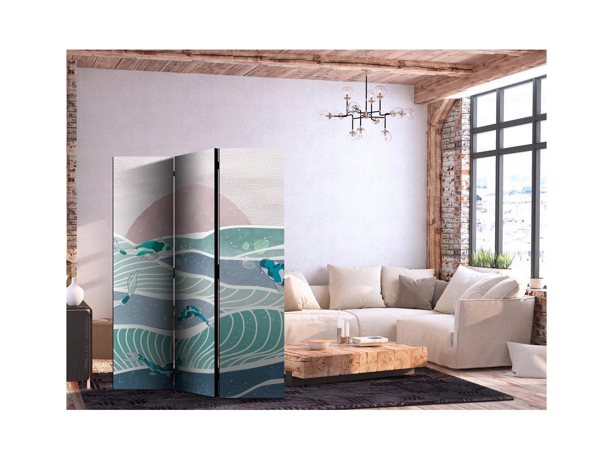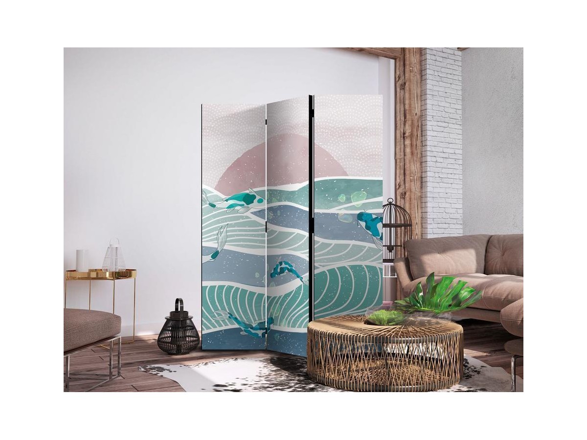 Les paravents décoratifs sont certainement une idée originale dans le domaine de la décoration intérieure. Les paravents remplissent un rôle décoratif, mais aussi bien pratique et fonctionnel. En effet, un paravent intérieur "Paravent - Picturesque Landscape With Fish - Sunset And Koi Fish in Shades of Turquoise And Blue. Floating Above The Water" est un meuble formant une cloison amovible et repliable qui peut servir pour délimiter un espace et diviser une grande pièce en deux espaces séparés. Le paravent intérieur est une invention qui est apparue pour la première fois en Chine. Depuis le début de leur existence, les paravents remplissaient des différentes fonctions, comme protéger contre les courants d'air ou bien encore créer un espace isolé pour l'intimité. De nos jours, le paravent intérieur est une belle décoration intérieure, qui permet aussi de gérer l'espace d’une ou de plusieurs pièces selon notre volonté. Le paravent intérieur est également utilisé dans les locaux de service, comme un coiffeur, un cabinet médical ou un bureau comptable pour créer un espace propice à l’intimité ou bien encore à la concentration.