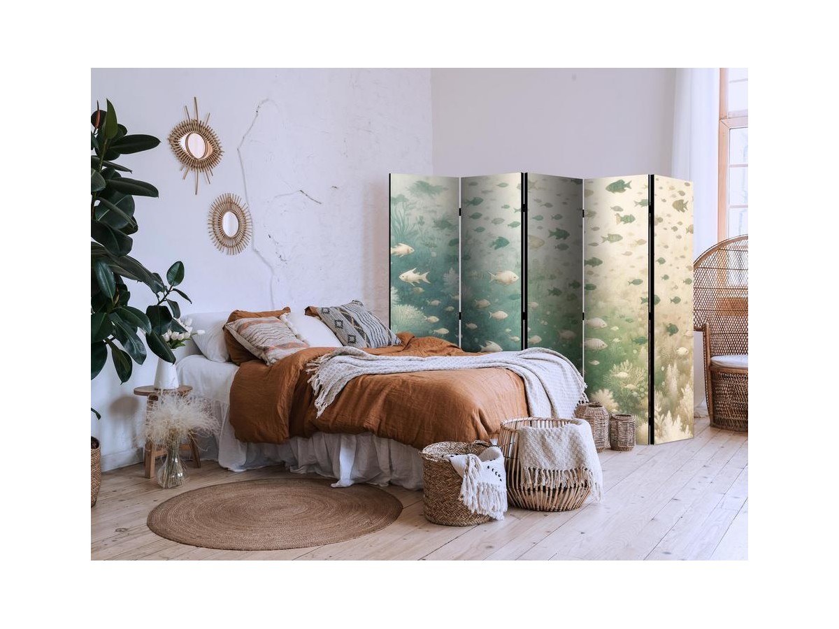 Les paravents décoratifs sont certainement une idée originale dans le domaine de la décoration intérieure. Les paravents remplissent un rôle décoratif, mais aussi bien pratique et fonctionnel. En effet, un paravent intérieur "Paravent - Fish and Diverse Vegetation - A Group of Fish in Pastel Muted Colors Among Oceanic Vegetation" est un meuble formant une cloison amovible et repliable qui peut servir pour délimiter un espace et diviser une grande pièce en deux espaces séparés. Le paravent intérieur est une invention qui est apparue pour la première fois en Chine. Depuis le début de leur existence, les paravents remplissaient des différentes fonctions, comme protéger contre les courants d'air ou bien encore créer un espace isolé pour l'intimité. De nos jours, le paravent intérieur est une belle décoration intérieure, qui permet aussi de gérer l'espace d’une ou de plusieurs pièces selon notre volonté. Le paravent intérieur est également utilisé dans les locaux de service, comme un coiffeur, un cabinet médical ou un bureau comptable pour créer un espace propice à l’intimité ou bien encore à la concentration.