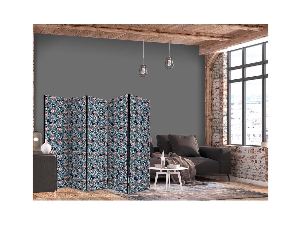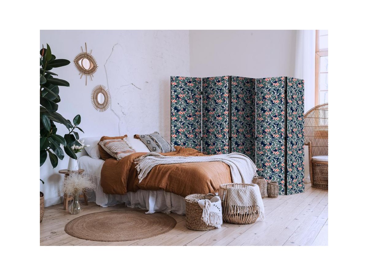 Un paravent décoratif "Paravent - Fish Among Leaves - Colorful Koi Fish Among Dark Green Water Lily Leaves on a Navy Water Surface" est composé de panneaux orientables, appelés volets, en bois encadrés d'un châssis de bois et réunis par des charnières. Le paravent décoratif disponible dans notre offre se compose de trois ou de cinq parties. Tous les paravents que nous proposons ont une impression de haute qualité sur l’entoilage qui peut être une belle décoration d'intérieur. L'entoilage d’un paravent déco est tendu sur un cadre en bois solide et léger en même temps. Les panneaux sont finis avec un ruban de satin. Les charnières métalliques sont durables et très solides.Caractéristique technique