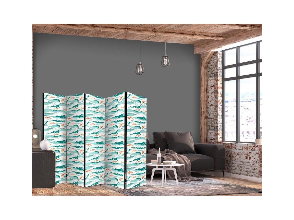 Les paravents décoratifs sont certainement une idée originale dans le domaine de la décoration intérieure. Les paravents remplissent un rôle décoratif, mais aussi bien pratique et fonctionnel. En effet, un paravent intérieur "Paravent - Fish Jumping Above The Waves - Oriental Fish And Water Lilies Among High Waves in Shades of Sea Green" est un meuble formant une cloison amovible et repliable qui peut servir pour délimiter un espace et diviser une grande pièce en deux espaces séparés. Le paravent intérieur est une invention qui est apparue pour la première fois en Chine. Depuis le début de leur existence, les paravents remplissaient des différentes fonctions, comme protéger contre les courants d'air ou bien encore créer un espace isolé pour l'intimité. De nos jours, le paravent intérieur est une belle décoration intérieure, qui permet aussi de gérer l'espace d’une ou de plusieurs pièces selon notre volonté. Le paravent intérieur est également utilisé dans les locaux de service, comme un coiffeur, un cabinet médical ou un bureau comptable pour créer un espace propice à l’intimité ou bien encore à la concentration.