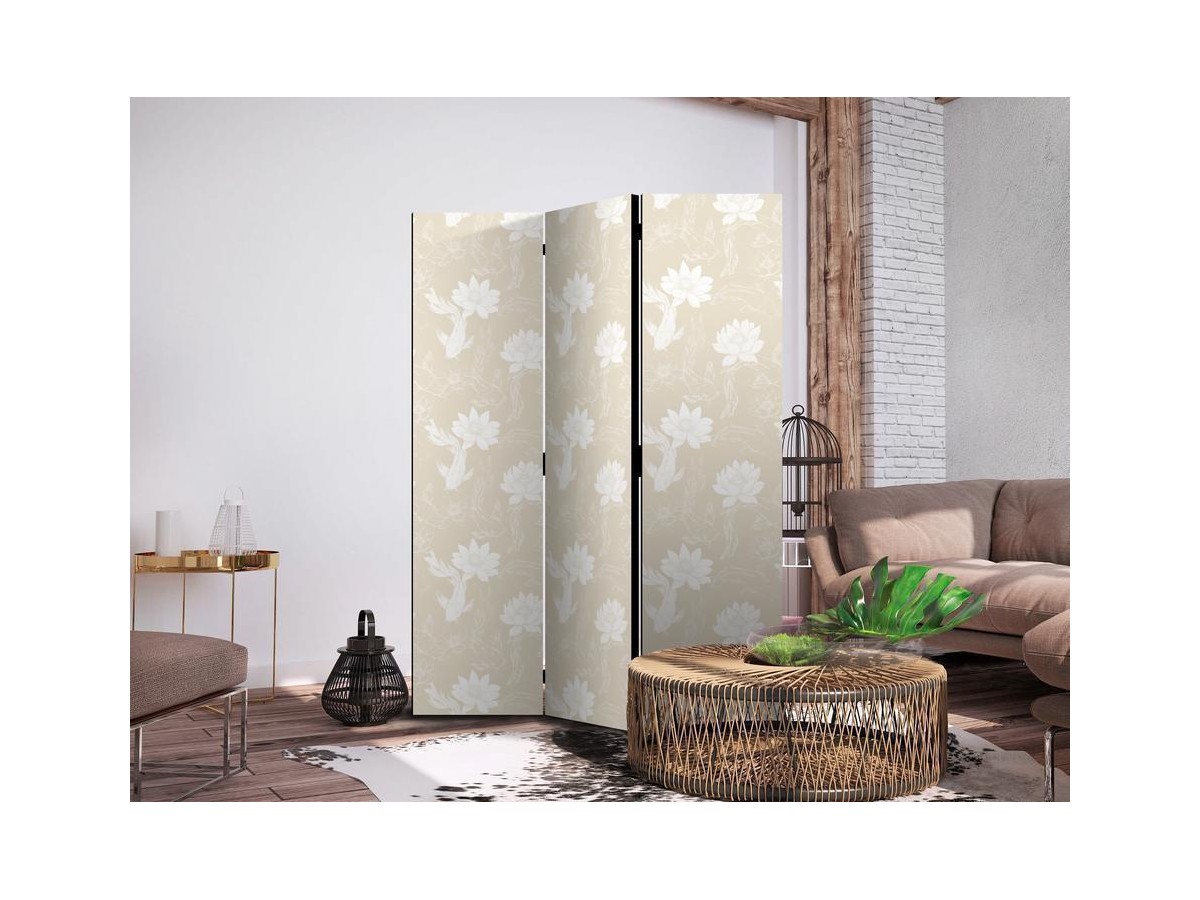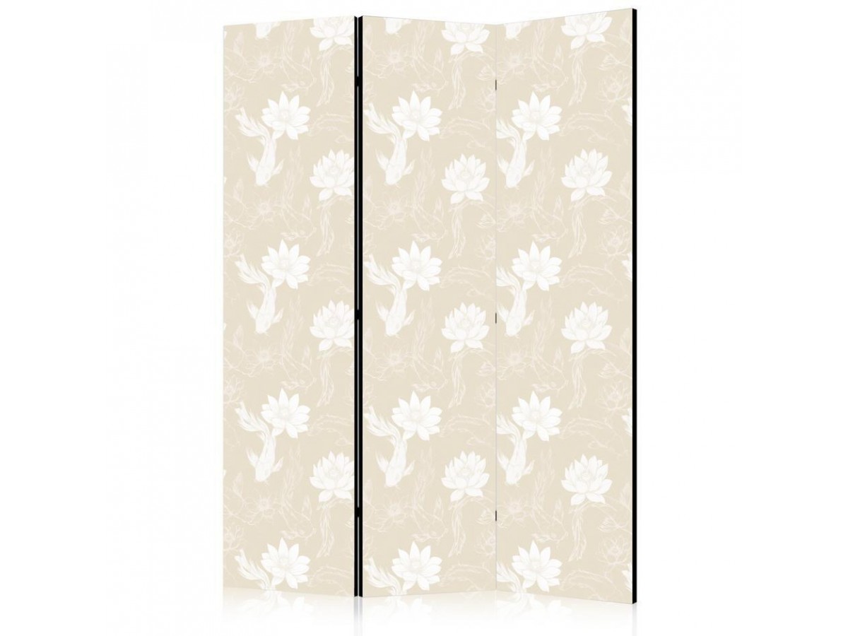 Paravent - Fish and Water Lilies - Bright Oriental Fish Swimming Among Water Flowers on a Delicate Sand-Beige Background