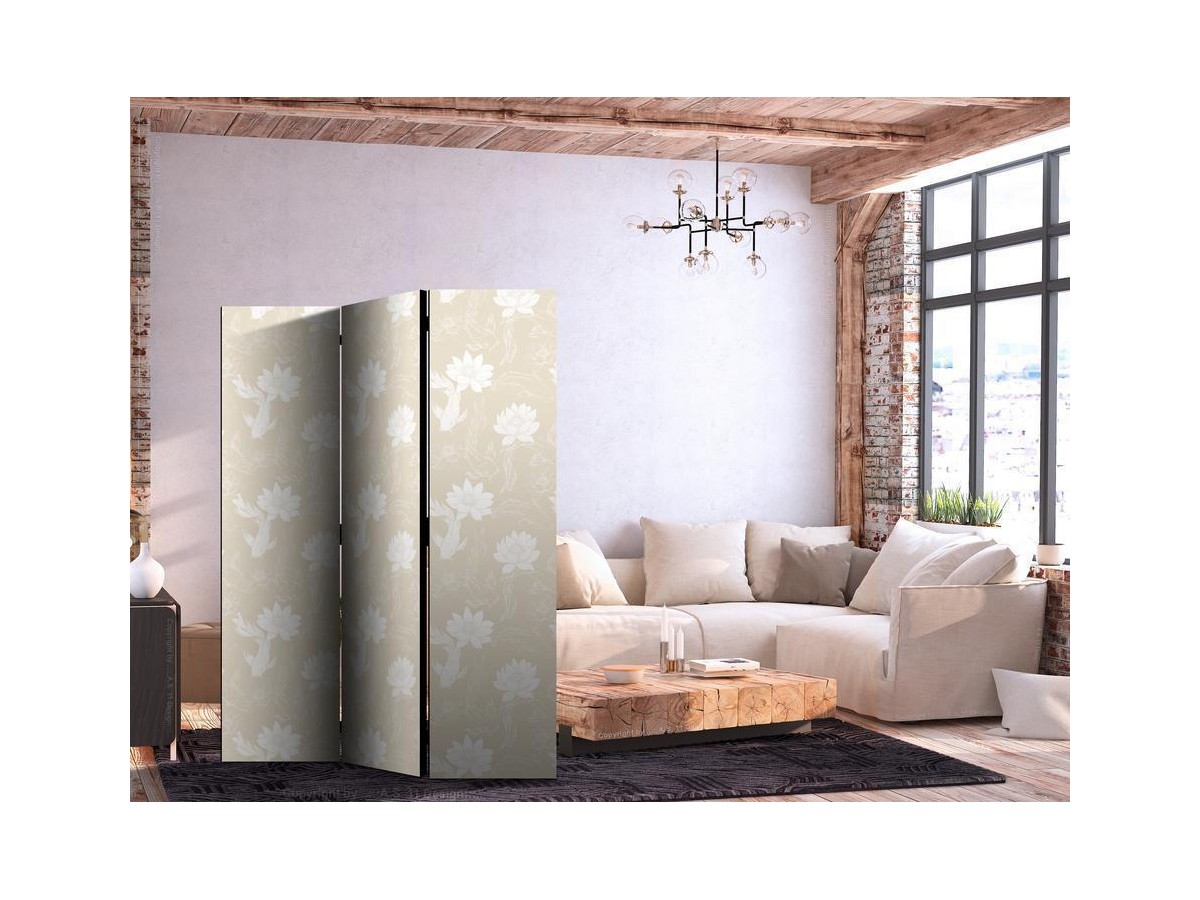Les paravents décoratifs sont certainement une idée originale dans le domaine de la décoration intérieure. Les paravents remplissent un rôle décoratif, mais aussi bien pratique et fonctionnel. En effet, un paravent intérieur "Paravent - Fish and Water Lilies - Bright Oriental Fish Swimming Among Water Flowers on a Delicate Sand-Beige Background" est un meuble formant une cloison amovible et repliable qui peut servir pour délimiter un espace et diviser une grande pièce en deux espaces séparés. Le paravent intérieur est une invention qui est apparue pour la première fois en Chine. Depuis le début de leur existence, les paravents remplissaient des différentes fonctions, comme protéger contre les courants d'air ou bien encore créer un espace isolé pour l'intimité. De nos jours, le paravent intérieur est une belle décoration intérieure, qui permet aussi de gérer l'espace d’une ou de plusieurs pièces selon notre volonté. Le paravent intérieur est également utilisé dans les locaux de service, comme un coiffeur, un cabinet médical ou un bureau comptable pour créer un espace propice à l’intimité ou bien encore à la concentration.