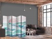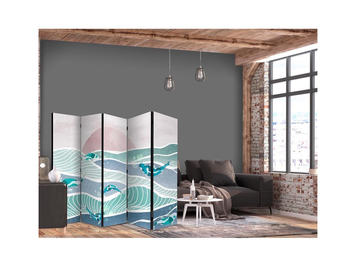 Les paravents décoratifs sont certainement une idée originale dans le domaine de la décoration intérieure. Les paravents remplissent un rôle décoratif, mais aussi bien pratique et fonctionnel. En effet, un paravent intérieur "Paravent - Picturesque Landscape With Fish - Sunset And Koi Fish in Shades of Turquoise And Blue. Floating Above The Water" est un meuble formant une cloison amovible et repliable qui peut servir pour délimiter un espace et diviser une grande pièce en deux espaces séparés. Le paravent intérieur est une invention qui est apparue pour la première fois en Chine. Depuis le début de leur existence, les paravents remplissaient des différentes fonctions, comme protéger contre les courants d'air ou bien encore créer un espace isolé pour l'intimité. De nos jours, le paravent intérieur est une belle décoration intérieure, qui permet aussi de gérer l'espace d’une ou de plusieurs pièces selon notre volonté. Le paravent intérieur est également utilisé dans les locaux de service, comme un coiffeur, un cabinet médical ou un bureau comptable pour créer un espace propice à l’intimité ou bien encore à la concentration.