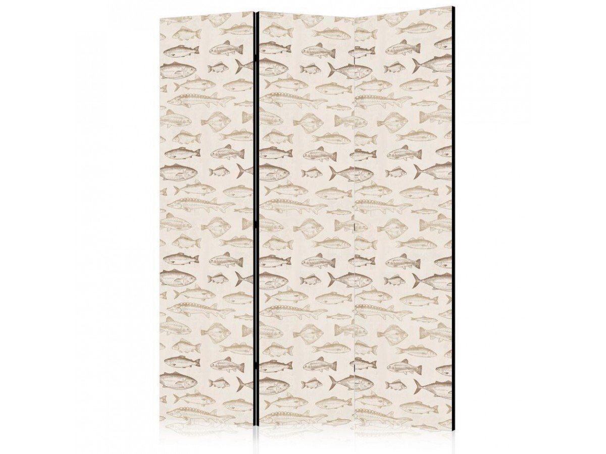 Les paravents décoratifs sont certainement une idée originale dans le domaine de la décoration intérieure. Les paravents remplissent un rôle décoratif, mais aussi bien pratique et fonctionnel. En effet, un paravent intérieur "Paravent - Fish in Beige Tones - Various Species of Fish in Beige-Brown Colors Presented in Vintage Style on a Light Background" est un meuble formant une cloison amovible et repliable qui peut servir pour délimiter un espace et diviser une grande pièce en deux espaces séparés. Le paravent intérieur est une invention qui est apparue pour la première fois en Chine. Depuis le début de leur existence, les paravents remplissaient des différentes fonctions, comme protéger contre les courants d'air ou bien encore créer un espace isolé pour l'intimité. De nos jours, le paravent intérieur est une belle décoration intérieure, qui permet aussi de gérer l'espace d’une ou de plusieurs pièces selon notre volonté. Le paravent intérieur est également utilisé dans les locaux de service, comme un coiffeur, un cabinet médical ou un bureau comptable pour créer un espace propice à l’intimité ou bien encore à la concentration.