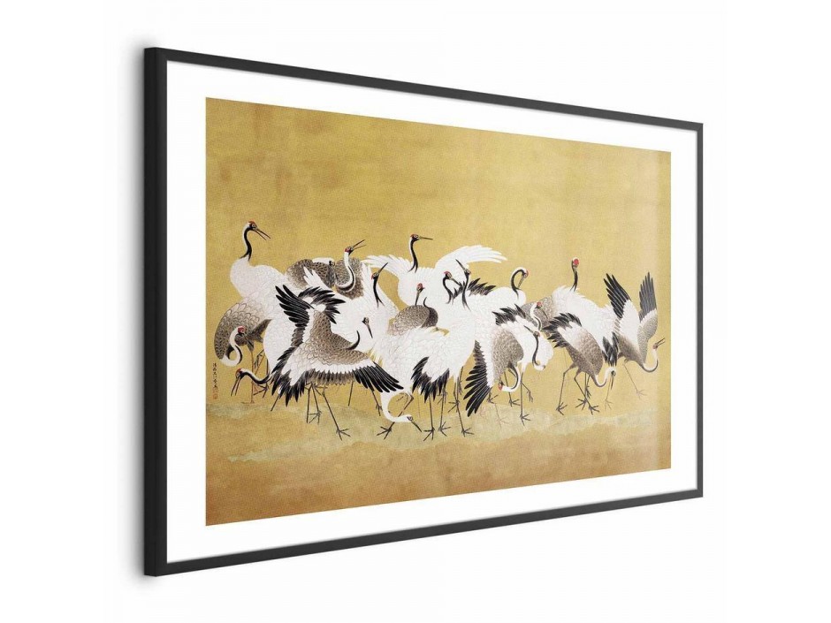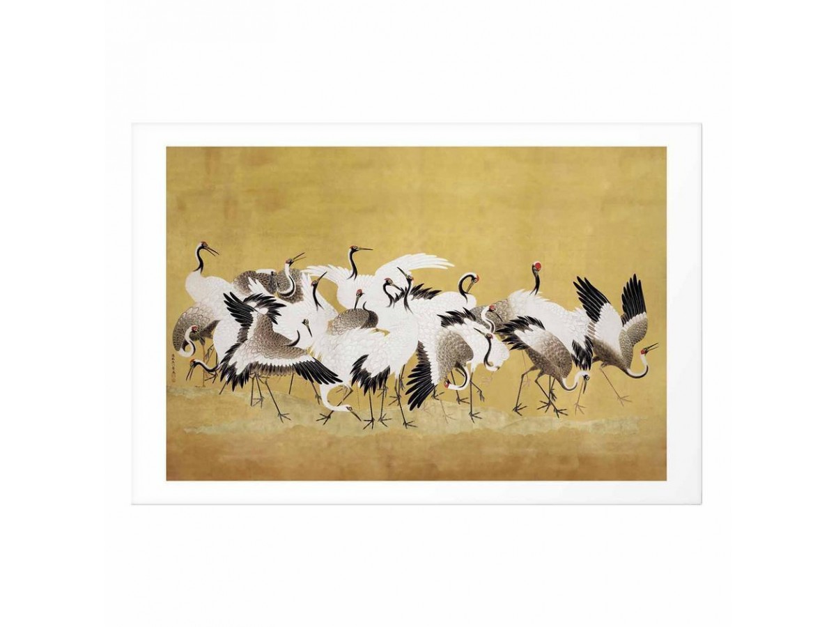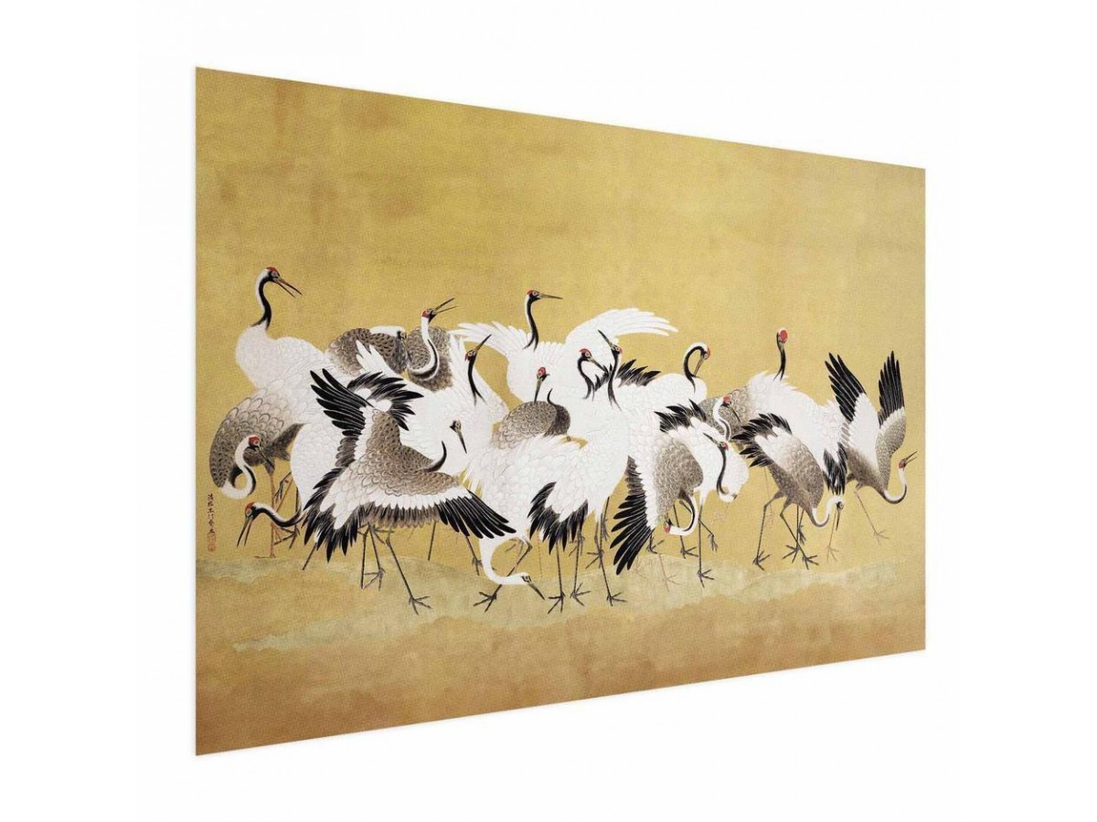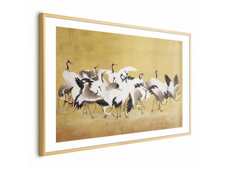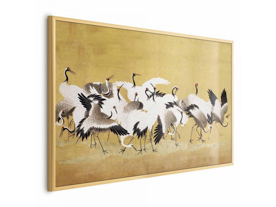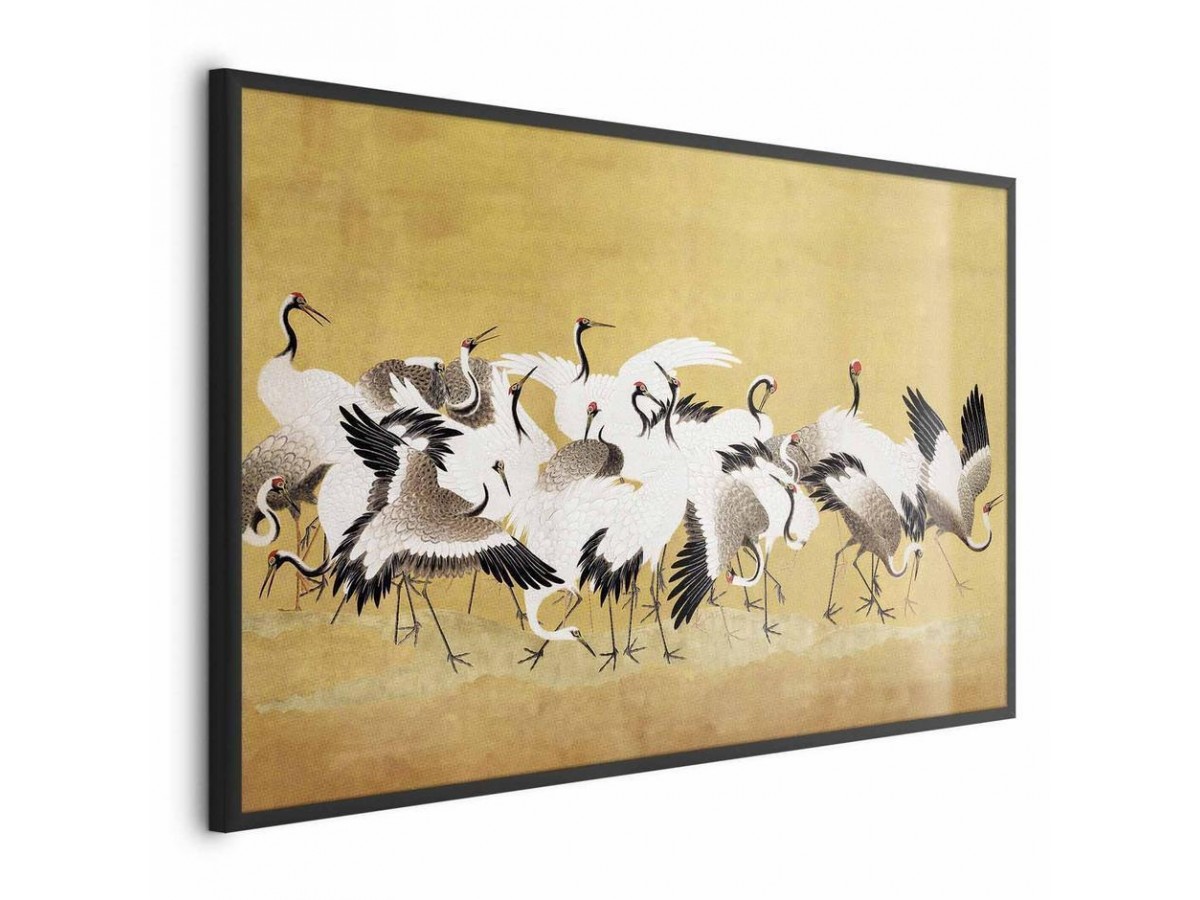 Poster - Japanese Cranes - a flock of birds against a golden background based on the painting of Ishida Yūtei