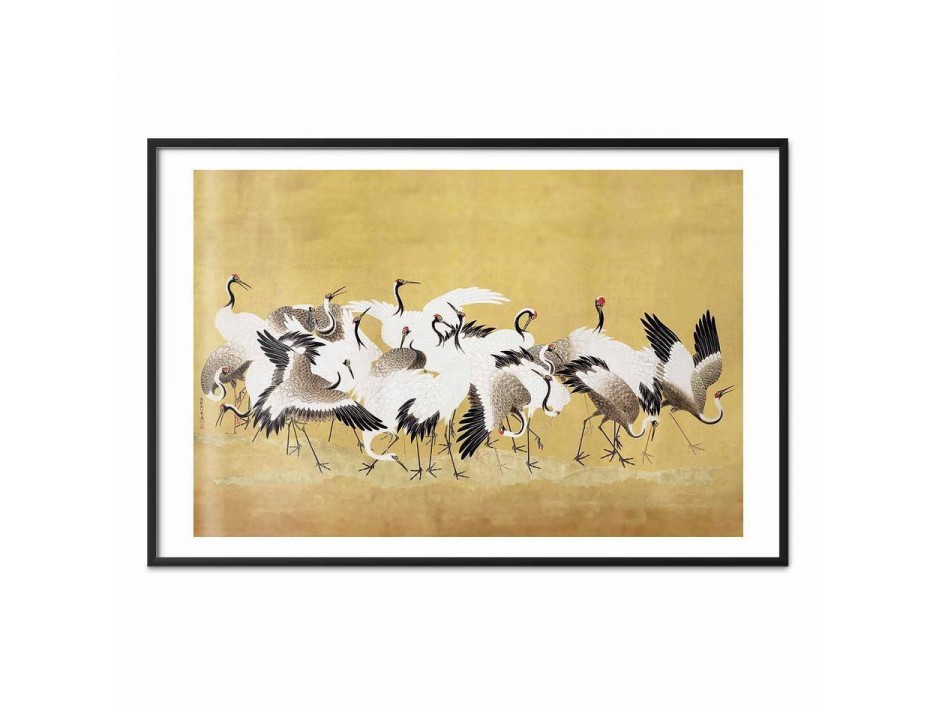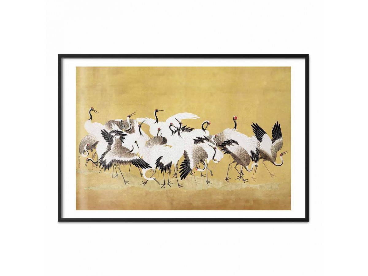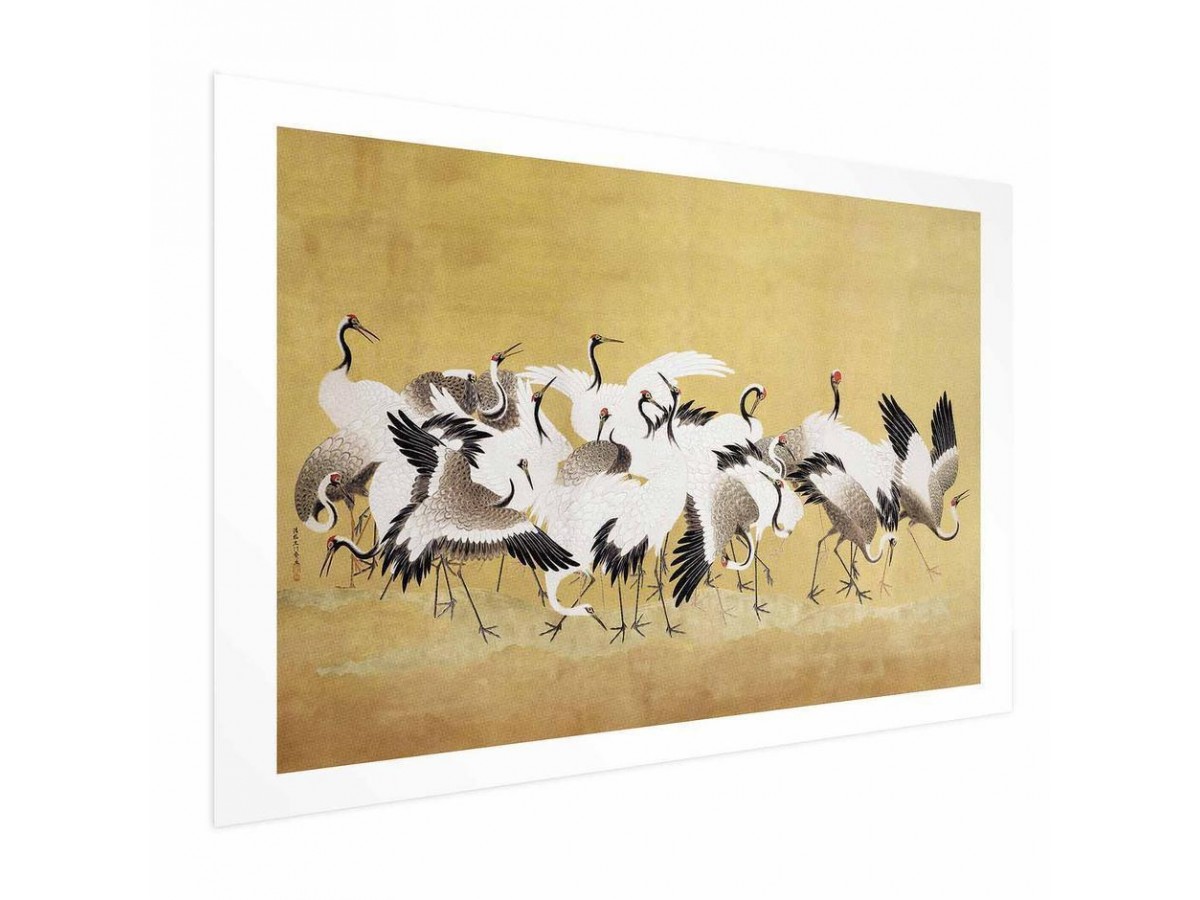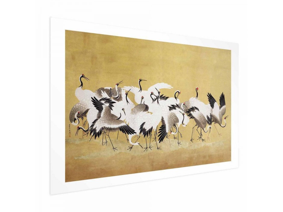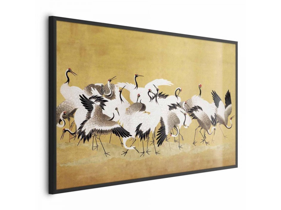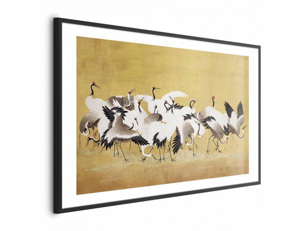 Poster - Japanese Cranes - a flock of birds against a golden background based on the painting of Ishida Yūtei
