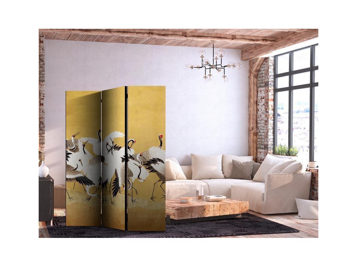 Les paravents décoratifs sont certainement une idée originale dans le domaine de la décoration intérieure. Les paravents remplissent un rôle décoratif, mais aussi bien pratique et fonctionnel. En effet, un paravent intérieur "Paravent - Japanese cranes - a flock of birds against a golden background based on a painting by Ishida Yūtei" est un meuble formant une cloison amovible et repliable qui peut servir pour délimiter un espace et diviser une grande pièce en deux espaces séparés. Le paravent intérieur est une invention qui est apparue pour la première fois en Chine. Depuis le début de leur existence, les paravents remplissaient des différentes fonctions, comme protéger contre les courants d'air ou bien encore créer un espace isolé pour l'intimité. De nos jours, le paravent intérieur est une belle décoration intérieure, qui permet aussi de gérer l'espace d’une ou de plusieurs pièces selon notre volonté. Le paravent intérieur est également utilisé dans les locaux de service, comme un coiffeur, un cabinet médical ou un bureau comptable pour créer un espace propice à l’intimité ou bien encore à la concentration.