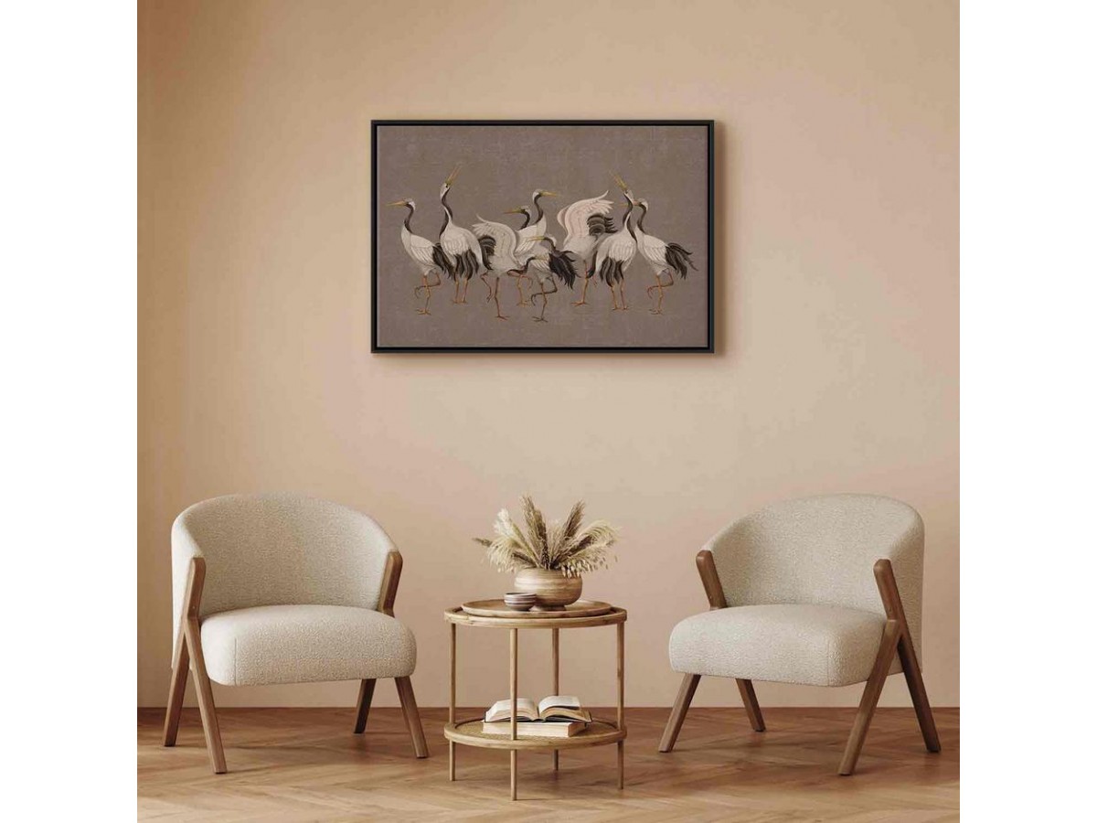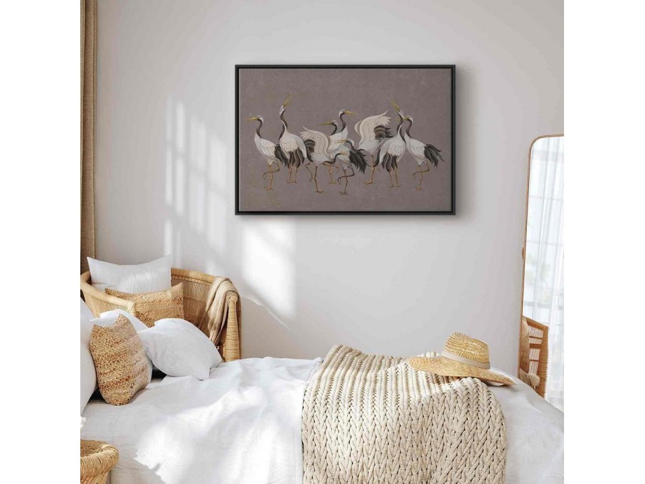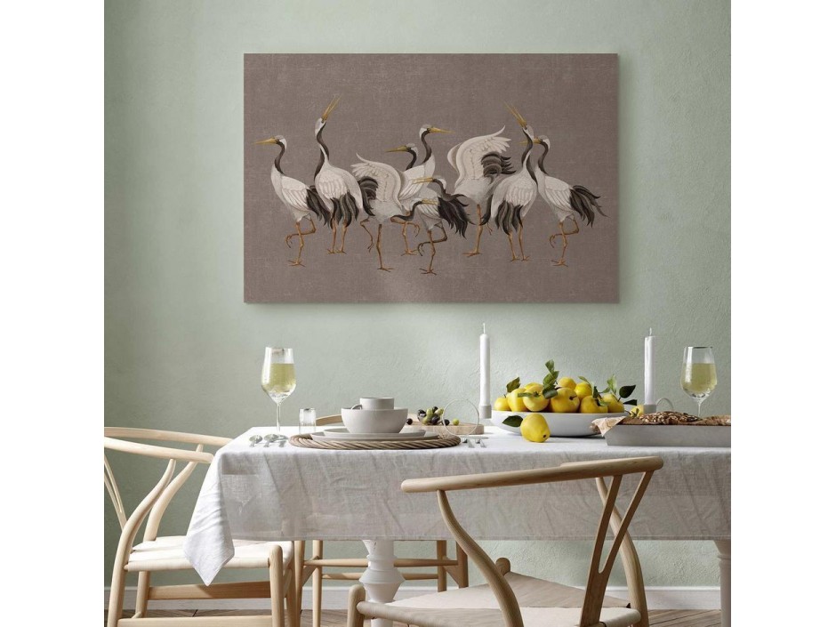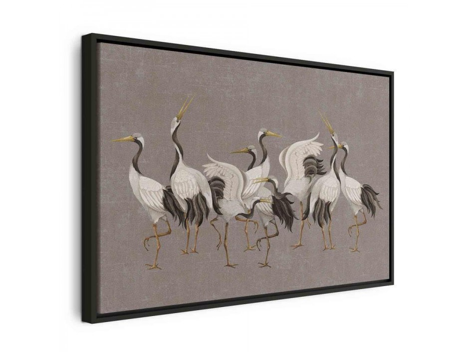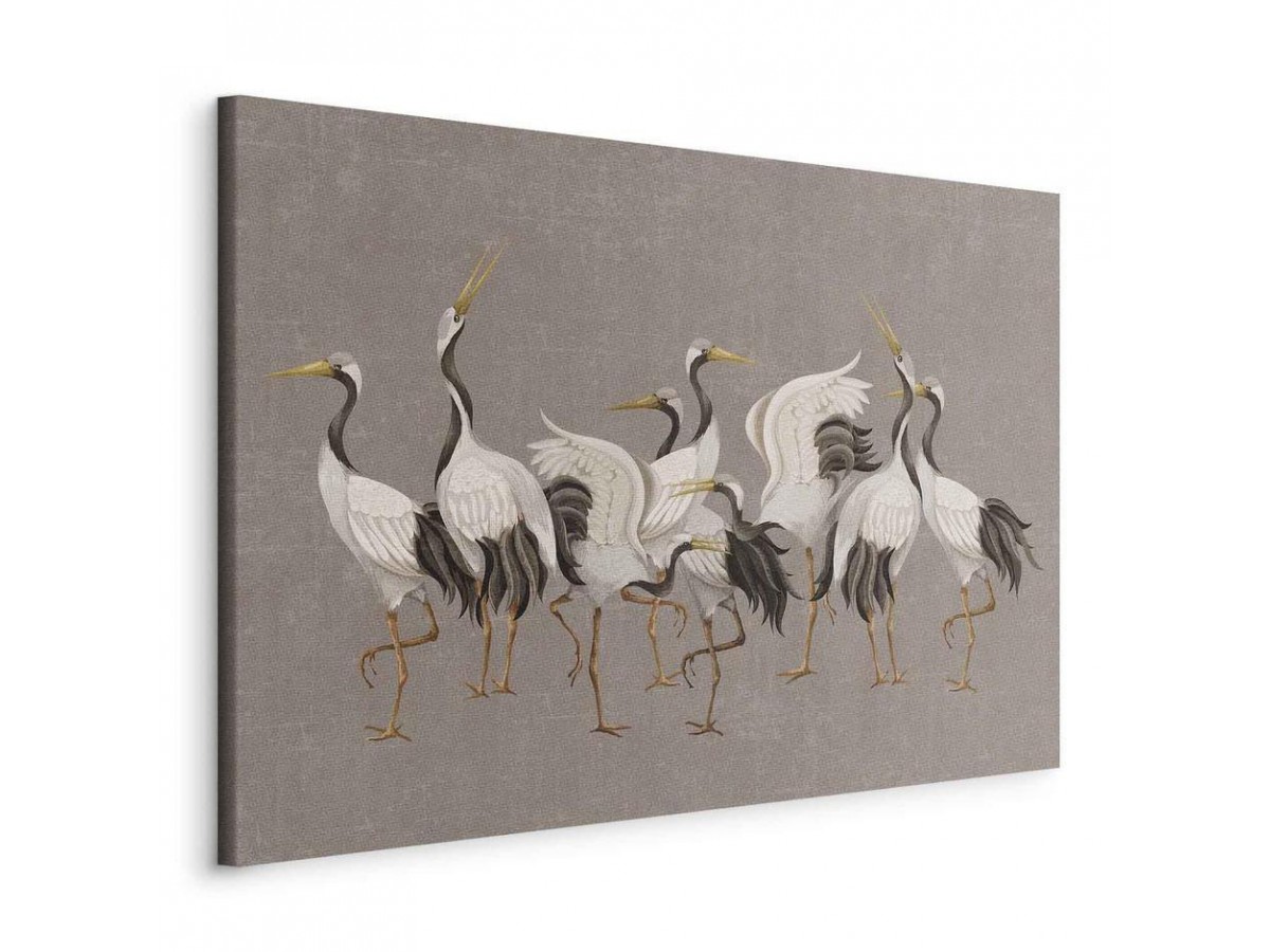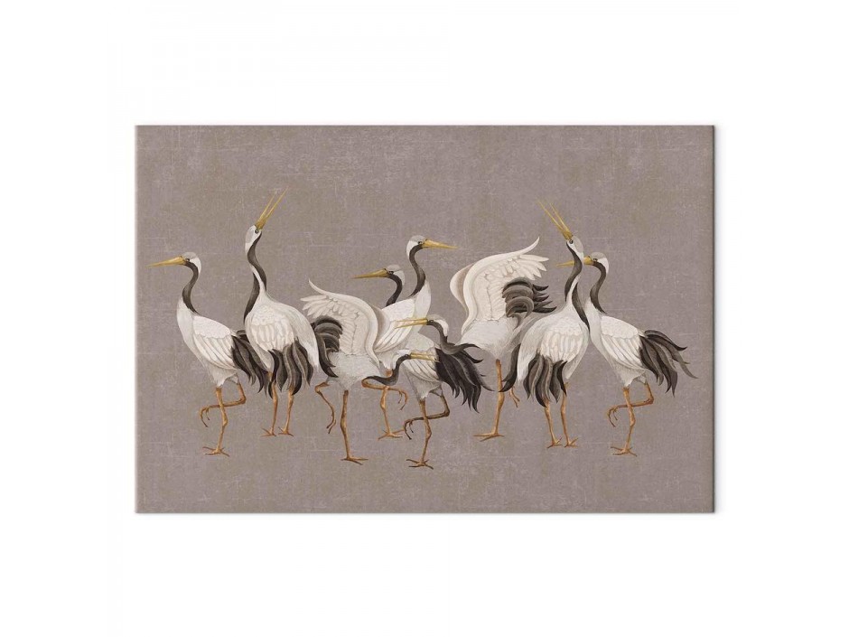 Tableau - Crane dance – bright silhouettes of birds against a warm grey background with texture