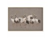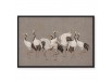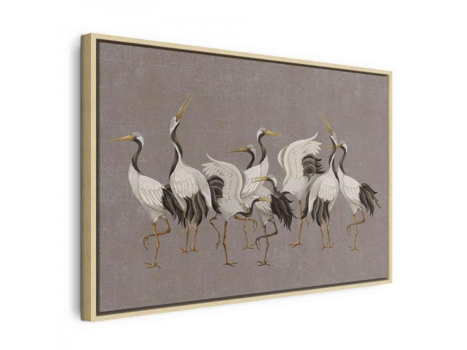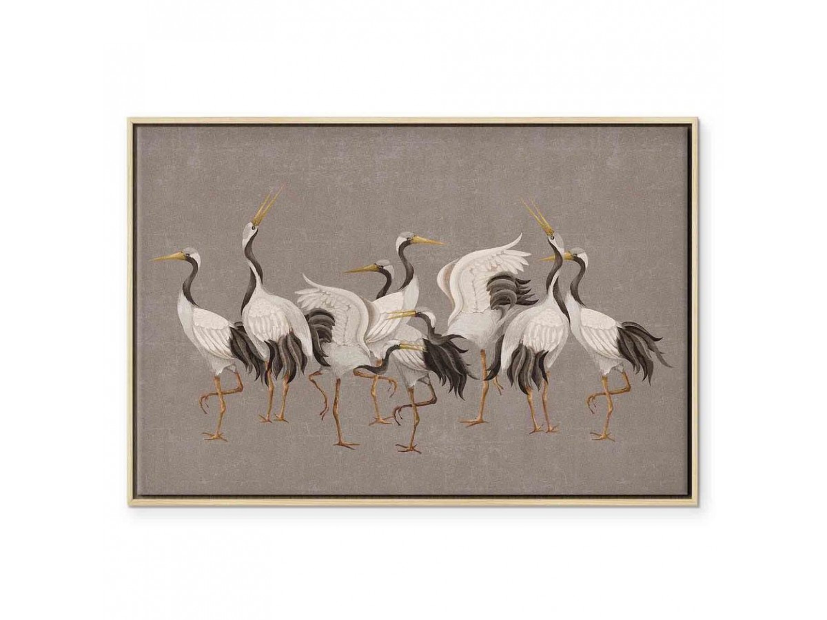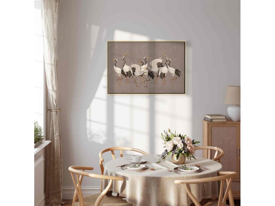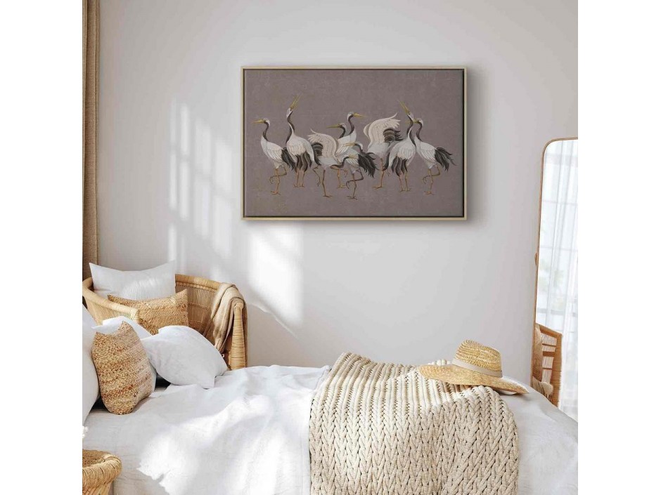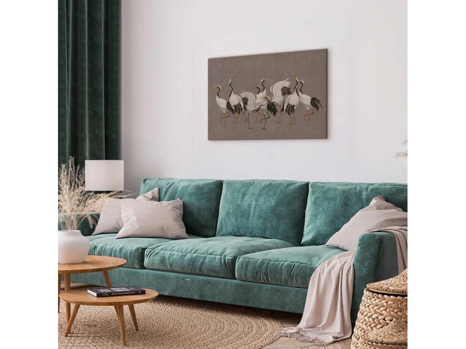 Tableau - Crane dance – bright silhouettes of birds against a warm grey background with texture