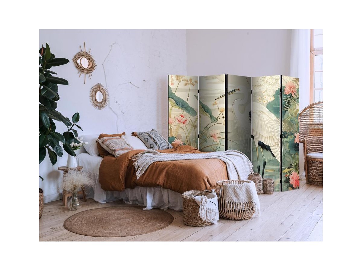 Un paravent décoratif "Paravent - By an Asian pond - an illustration in the style of a Japanese engraving, depicting a heron" est composé de panneaux orientables, appelés volets, en bois encadrés d'un châssis de bois et réunis par des charnières. Le paravent décoratif disponible dans notre offre se compose de trois ou de cinq parties. Tous les paravents que nous proposons ont une impression de haute qualité sur l’entoilage qui peut être une belle décoration d'intérieur. L'entoilage d’un paravent déco est tendu sur un cadre en bois solide et léger en même temps. Les panneaux sont finis avec un ruban de satin. Les charnières métalliques sont durables et très solides.Caractéristique technique