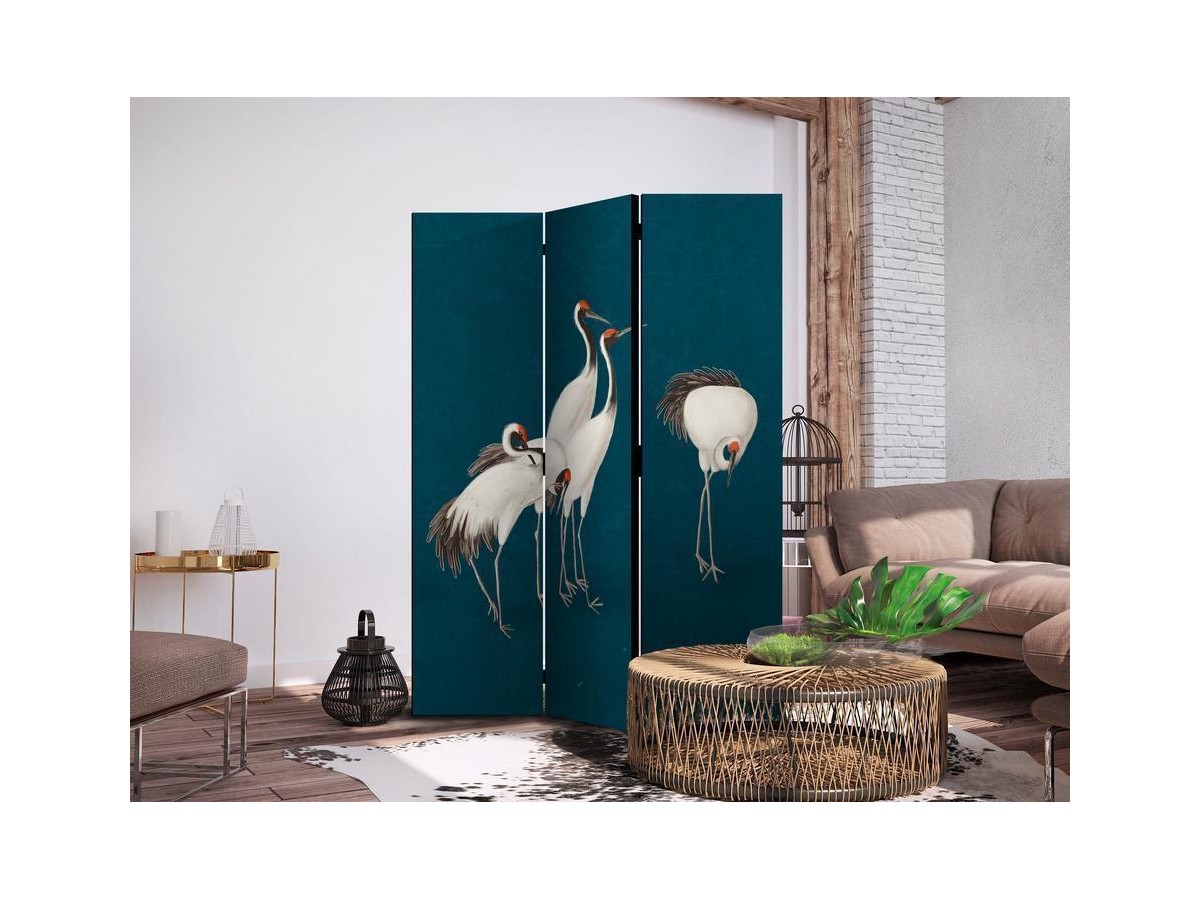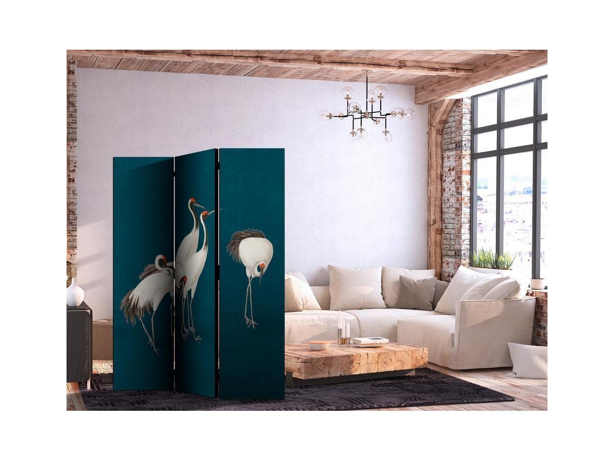 Les paravents décoratifs sont certainement une idée originale dans le domaine de la décoration intérieure. Les paravents remplissent un rôle décoratif, mais aussi bien pratique et fonctionnel. En effet, un paravent intérieur "Paravent - Evening by the pond - a group of cranes drawn with dry pastels on a dark turquoise background" est un meuble formant une cloison amovible et repliable qui peut servir pour délimiter un espace et diviser une grande pièce en deux espaces séparés. Le paravent intérieur est une invention qui est apparue pour la première fois en Chine. Depuis le début de leur existence, les paravents remplissaient des différentes fonctions, comme protéger contre les courants d'air ou bien encore créer un espace isolé pour l'intimité. De nos jours, le paravent intérieur est une belle décoration intérieure, qui permet aussi de gérer l'espace d’une ou de plusieurs pièces selon notre volonté. Le paravent intérieur est également utilisé dans les locaux de service, comme un coiffeur, un cabinet médical ou un bureau comptable pour créer un espace propice à l’intimité ou bien encore à la concentration.