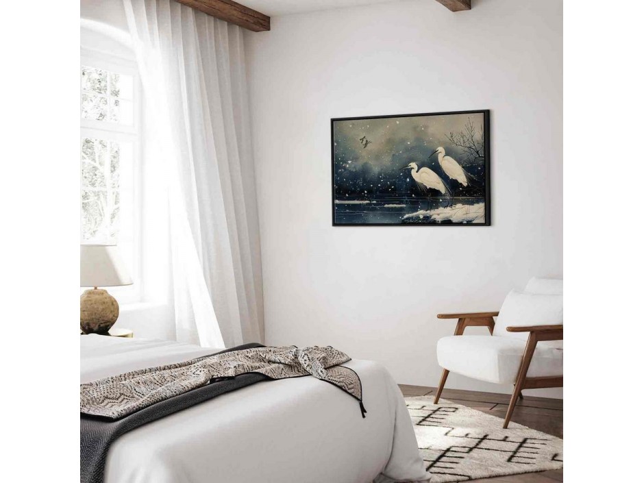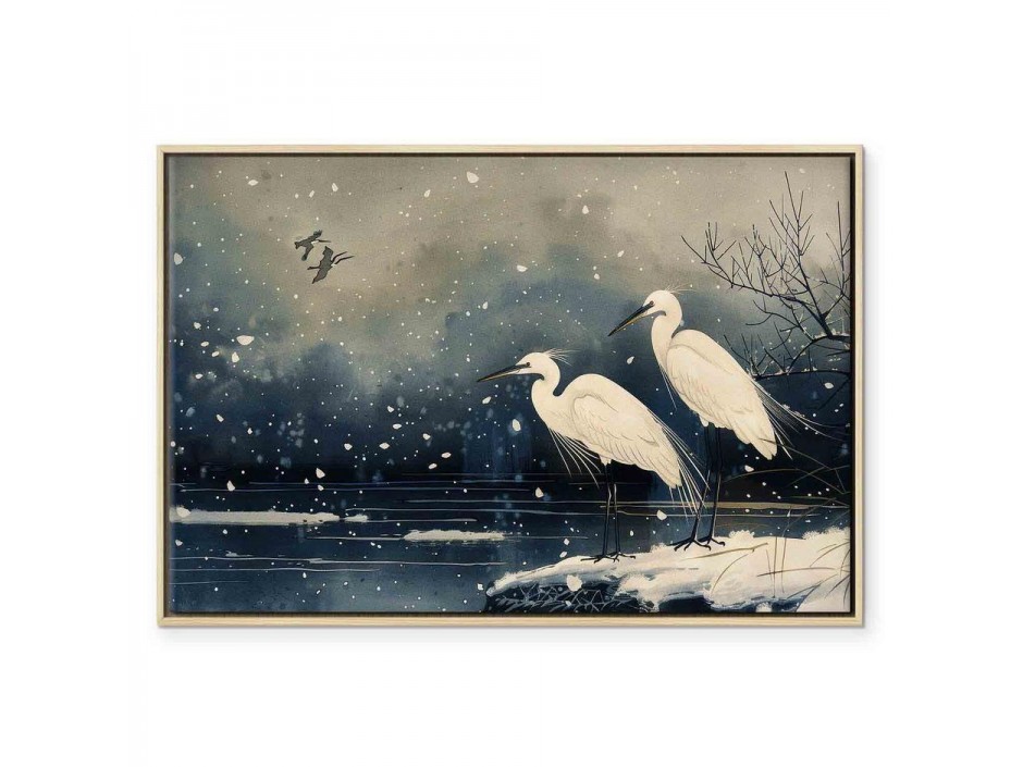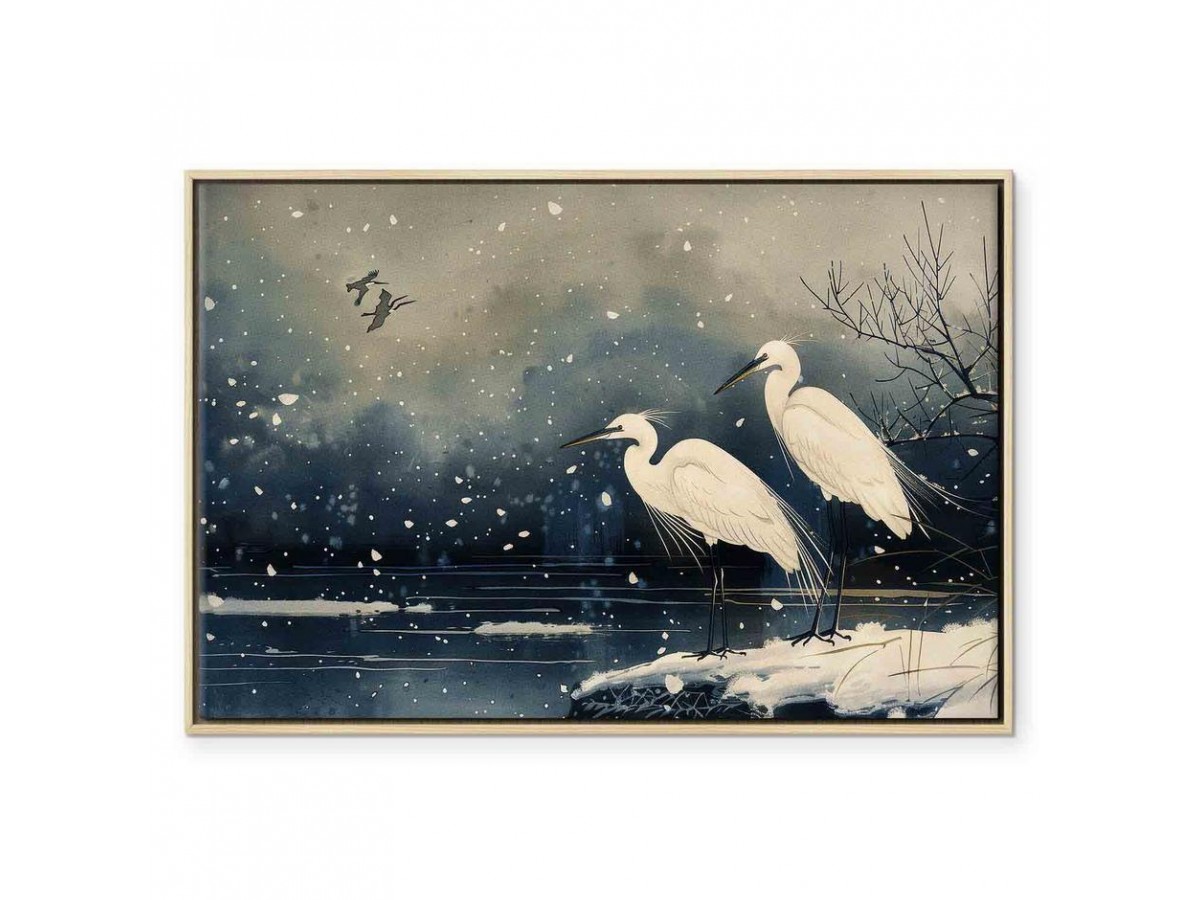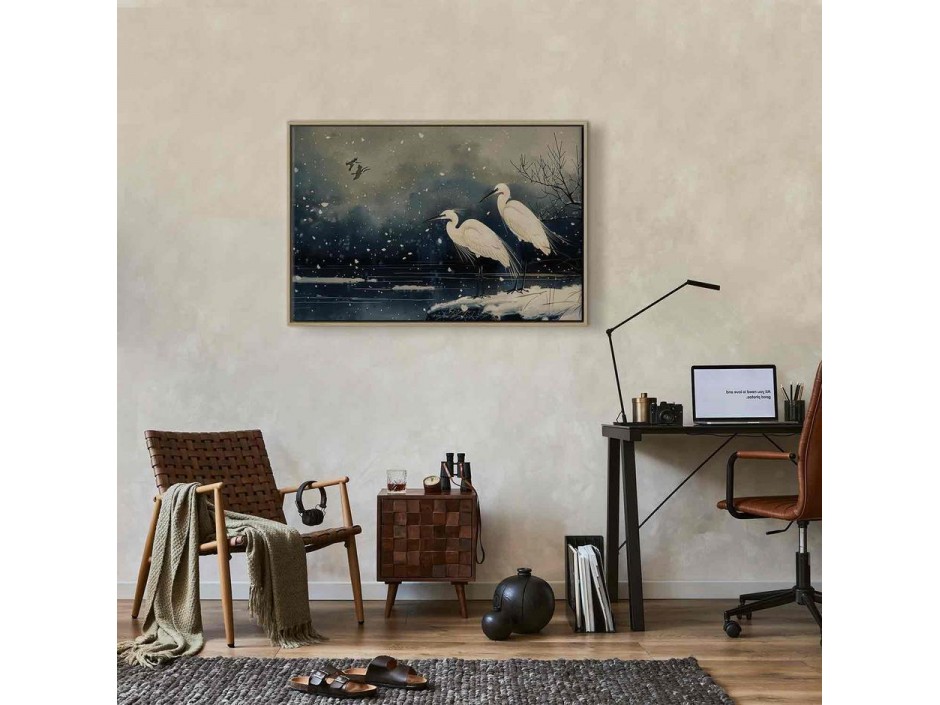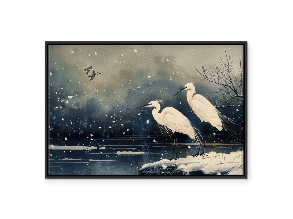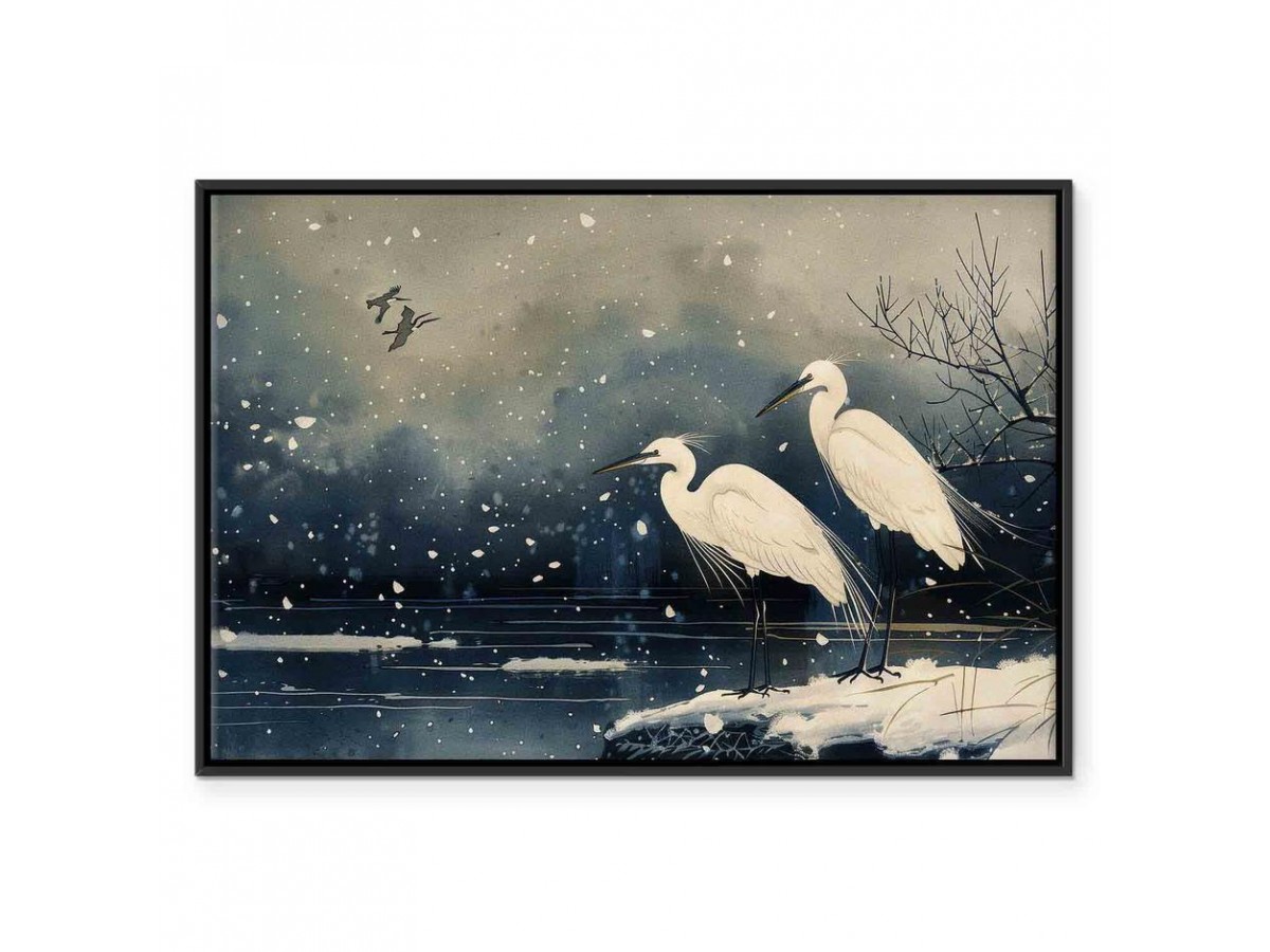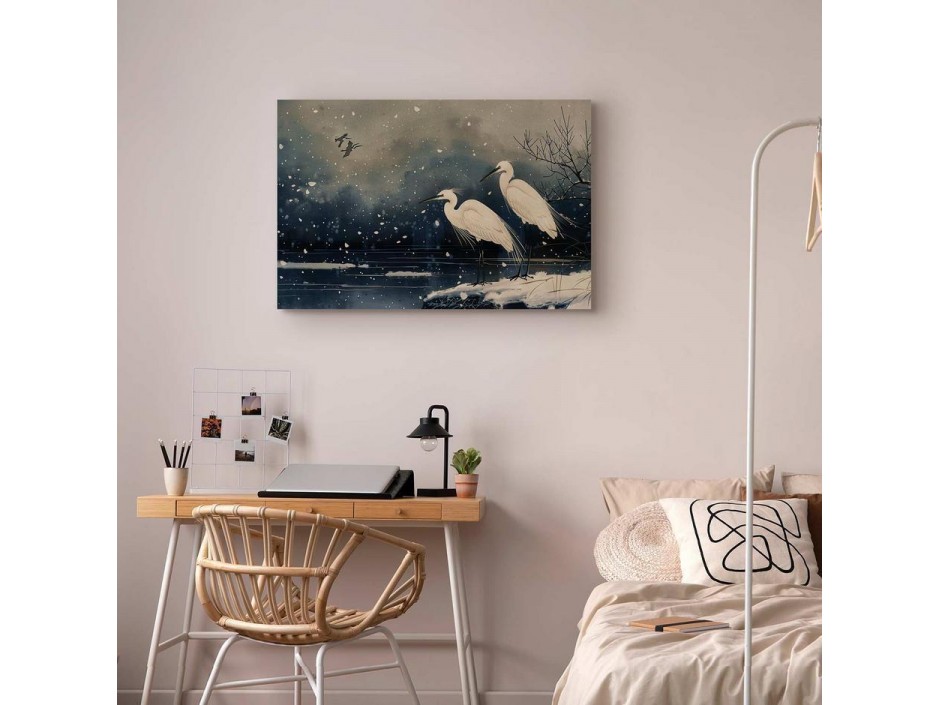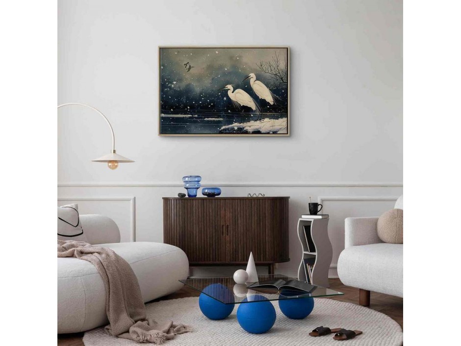 Tableau - Herons over a winter pond - Japanese-style illustration in dark colours