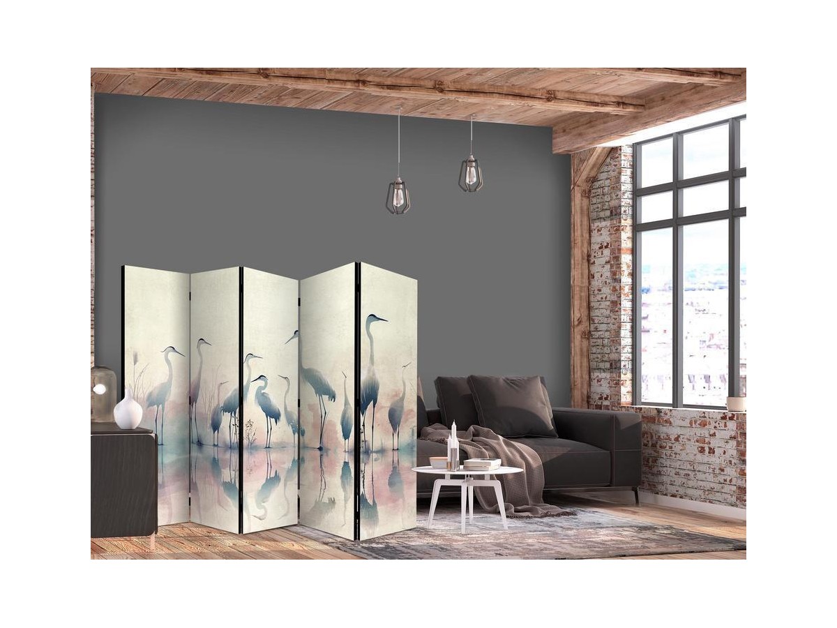 Un paravent décoratif "Paravent - Birds by the lake - herons painted in watercolours in delicate grey and pink colours" est composé de panneaux orientables, appelés volets, en bois encadrés d'un châssis de bois et réunis par des charnières. Le paravent décoratif disponible dans notre offre se compose de trois ou de cinq parties. Tous les paravents que nous proposons ont une impression de haute qualité sur l’entoilage qui peut être une belle décoration d'intérieur. L'entoilage d’un paravent déco est tendu sur un cadre en bois solide et léger en même temps. Les panneaux sont finis avec un ruban de satin. Les charnières métalliques sont durables et très solides.Caractéristique technique