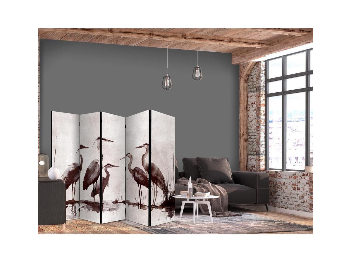 Un paravent décoratif "Paravent - Herons painted with ink" est composé de panneaux orientables, appelés volets, en bois encadrés d'un châssis de bois et réunis par des charnières. Le paravent décoratif disponible dans notre offre se compose de trois ou de cinq parties. Tous les paravents que nous proposons ont une impression de haute qualité sur l’entoilage qui peut être une belle décoration d'intérieur. L'entoilage d’un paravent déco est tendu sur un cadre en bois solide et léger en même temps. Les panneaux sont finis avec un ruban de satin. Les charnières métalliques sont durables et très solides.Caractéristique technique