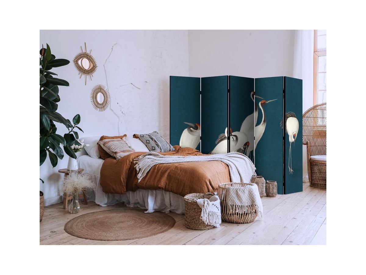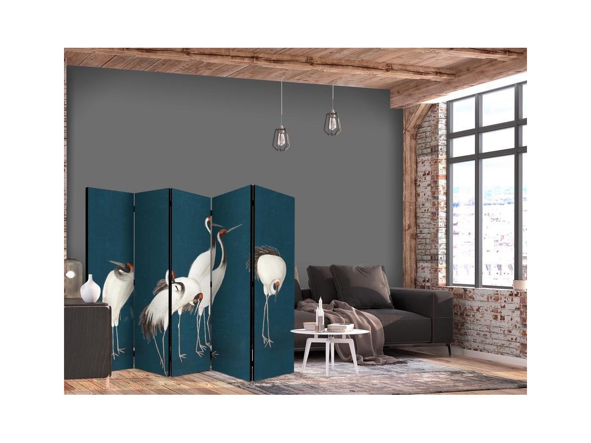 Les paravents décoratifs sont certainement une idée originale dans le domaine de la décoration intérieure. Les paravents remplissent un rôle décoratif, mais aussi bien pratique et fonctionnel. En effet, un paravent intérieur "Paravent - Evening by the pond - a group of cranes drawn with dry pastels on a dark turquoise background" est un meuble formant une cloison amovible et repliable qui peut servir pour délimiter un espace et diviser une grande pièce en deux espaces séparés. Le paravent intérieur est une invention qui est apparue pour la première fois en Chine. Depuis le début de leur existence, les paravents remplissaient des différentes fonctions, comme protéger contre les courants d'air ou bien encore créer un espace isolé pour l'intimité. De nos jours, le paravent intérieur est une belle décoration intérieure, qui permet aussi de gérer l'espace d’une ou de plusieurs pièces selon notre volonté. Le paravent intérieur est également utilisé dans les locaux de service, comme un coiffeur, un cabinet médical ou un bureau comptable pour créer un espace propice à l’intimité ou bien encore à la concentration.