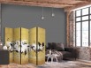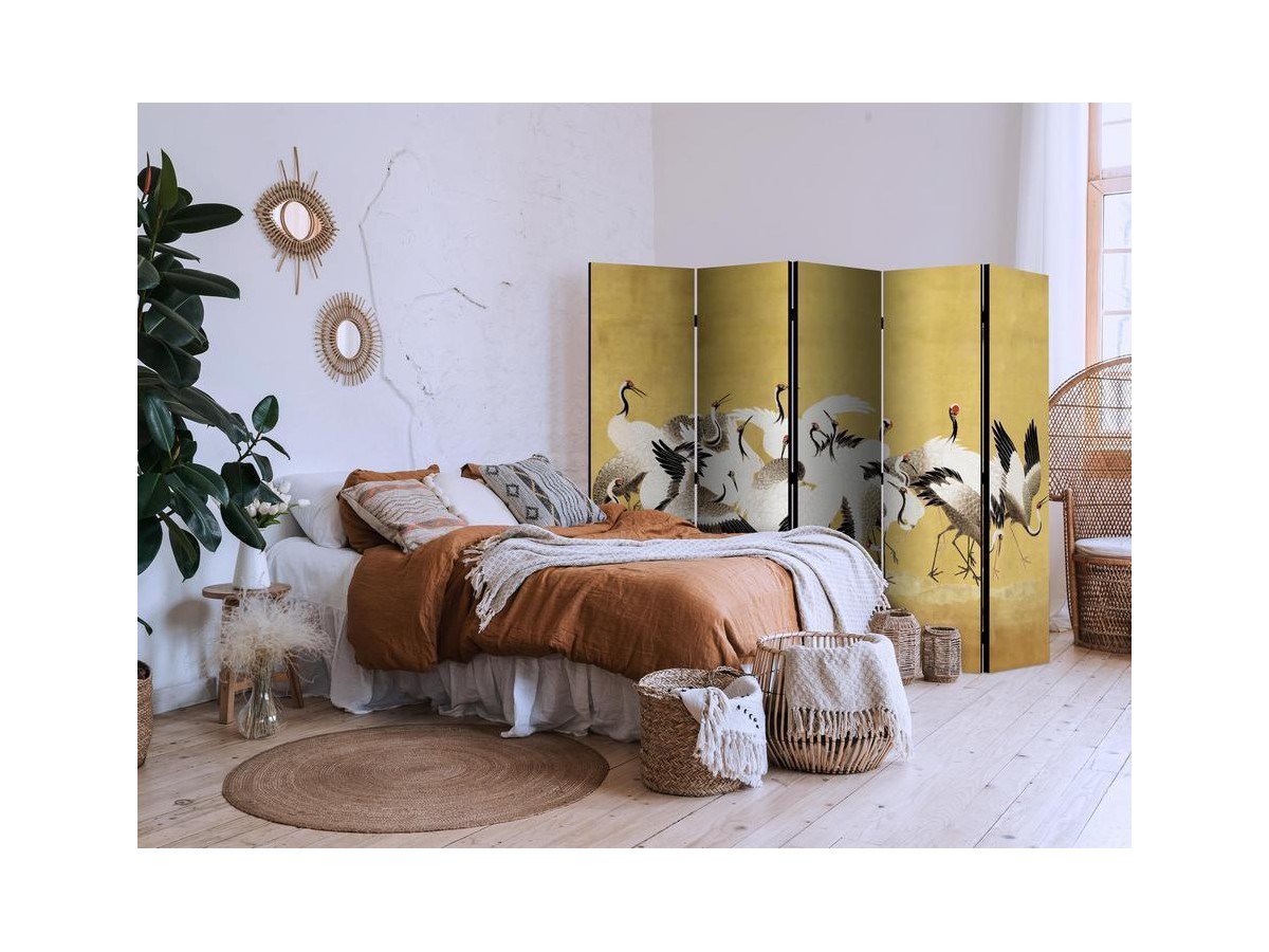 Un paravent décoratif "Paravent - Japanese cranes - a flock of birds against a golden background based on a painting by Ishida Yūtei" est composé de panneaux orientables, appelés volets, en bois encadrés d'un châssis de bois et réunis par des charnières. Le paravent décoratif disponible dans notre offre se compose de trois ou de cinq parties. Tous les paravents que nous proposons ont une impression de haute qualité sur l’entoilage qui peut être une belle décoration d'intérieur. L'entoilage d’un paravent déco est tendu sur un cadre en bois solide et léger en même temps. Les panneaux sont finis avec un ruban de satin. Les charnières métalliques sont durables et très solides.Caractéristique technique