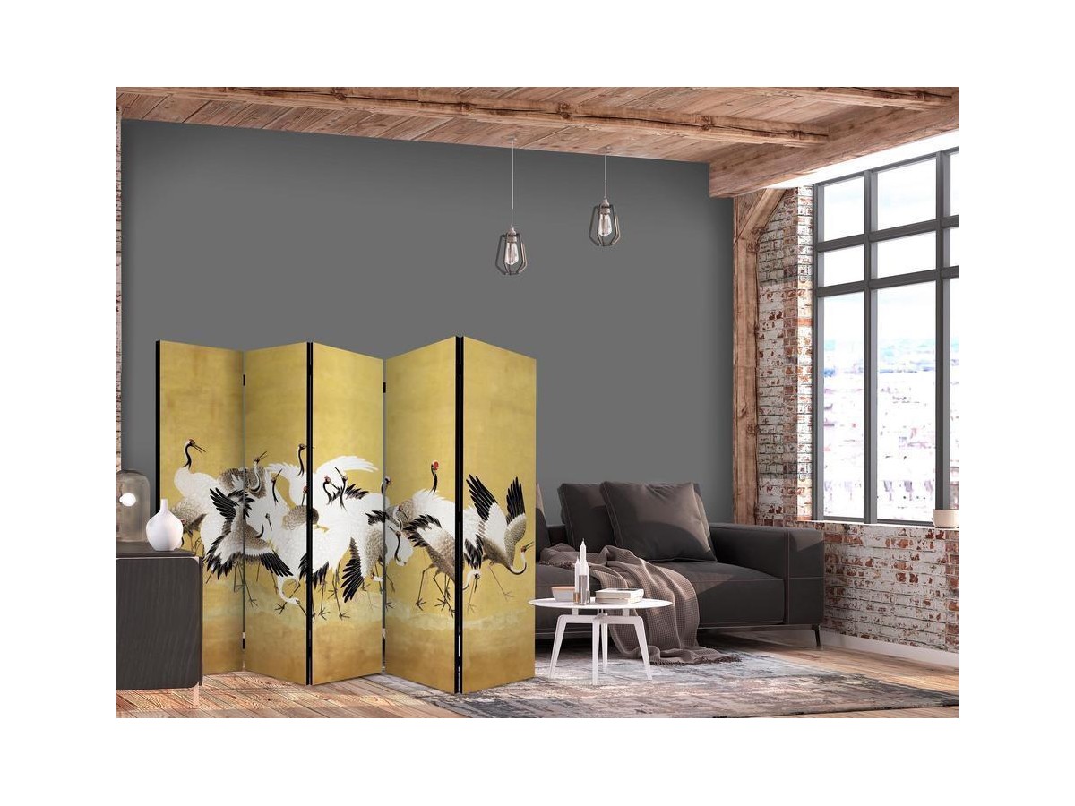 Les paravents décoratifs sont certainement une idée originale dans le domaine de la décoration intérieure. Les paravents remplissent un rôle décoratif, mais aussi bien pratique et fonctionnel. En effet, un paravent intérieur "Paravent - Japanese cranes - a flock of birds against a golden background based on a painting by Ishida Yūtei" est un meuble formant une cloison amovible et repliable qui peut servir pour délimiter un espace et diviser une grande pièce en deux espaces séparés. Le paravent intérieur est une invention qui est apparue pour la première fois en Chine. Depuis le début de leur existence, les paravents remplissaient des différentes fonctions, comme protéger contre les courants d'air ou bien encore créer un espace isolé pour l'intimité. De nos jours, le paravent intérieur est une belle décoration intérieure, qui permet aussi de gérer l'espace d’une ou de plusieurs pièces selon notre volonté. Le paravent intérieur est également utilisé dans les locaux de service, comme un coiffeur, un cabinet médical ou un bureau comptable pour créer un espace propice à l’intimité ou bien encore à la concentration.