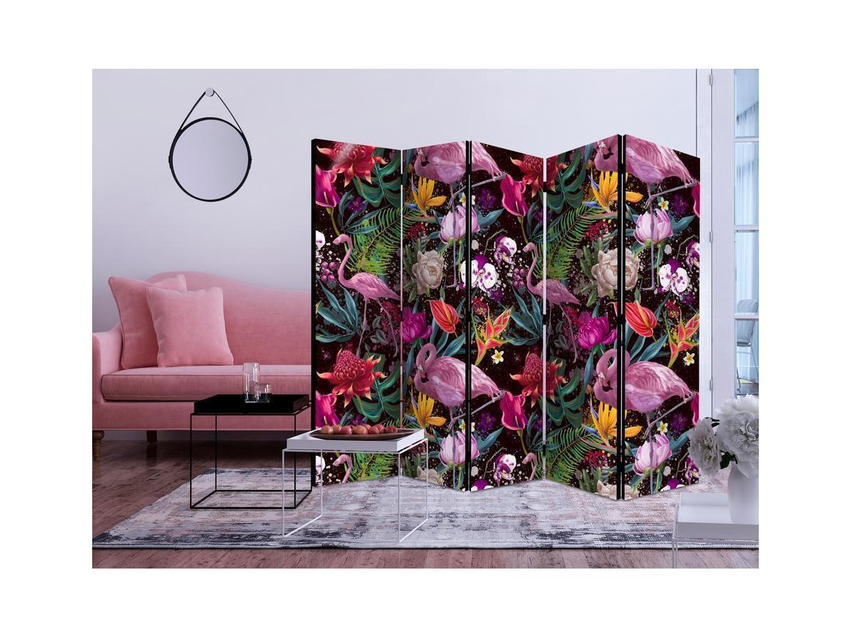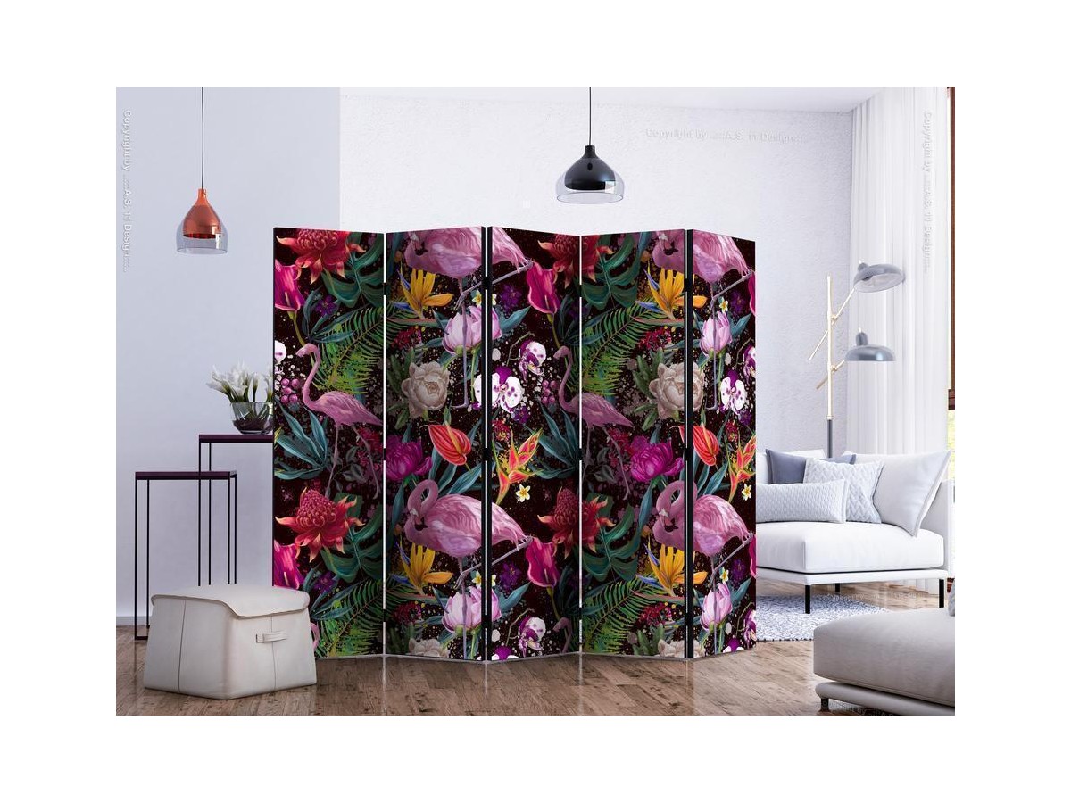 Les paravents décoratifs sont certainement une idée originale dans le domaine de la décoration intérieure. Les paravents remplissent un rôle décoratif, mais aussi bien pratique et fonctionnel. En effet, un paravent intérieur "Paravent - Colorful Exotic II" est un meuble formant une cloison amovible et repliable qui peut servir pour délimiter un espace et diviser une grande pièce en deux espaces séparés. Le paravent intérieur est une invention qui est apparue pour la première fois en Chine. Depuis le début de leur existence, les paravents remplissaient des différentes fonctions, comme protéger contre les courants d'air ou bien encore créer un espace isolé pour l'intimité. De nos jours, le paravent intérieur est une belle décoration intérieure, qui permet aussi de gérer l'espace d’une ou de plusieurs pièces selon notre volonté. Le paravent intérieur est également utilisé dans les locaux de service, comme un coiffeur, un cabinet médical ou un bureau comptable pour créer un espace propice à l’intimité ou bien encore à la concentration.