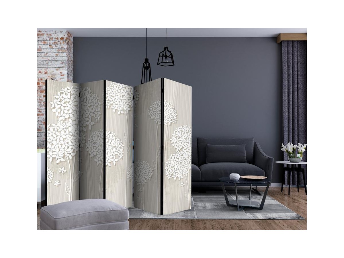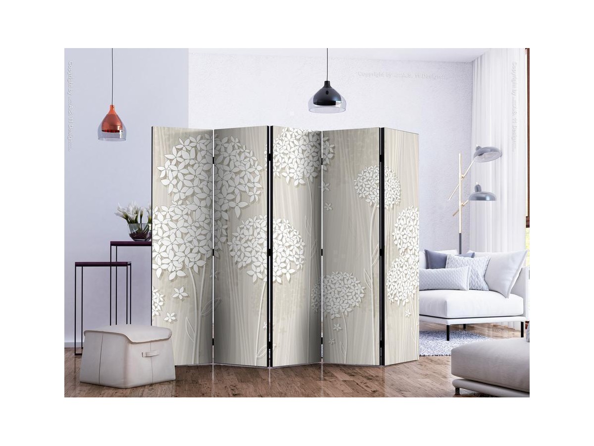 Un paravent décoratif "Paravent - Creamy Daintiness II" est composé de panneaux orientables, appelés volets, en bois encadrés d'un châssis de bois et réunis par des charnières. Le paravent décoratif disponible dans notre offre se compose de trois ou de cinq parties. Tous les paravents que nous proposons ont une impression de haute qualité sur l’entoilage qui peut être une belle décoration d'intérieur. L'entoilage d’un paravent déco est tendu sur un cadre en bois solide et léger en même temps. Les panneaux sont finis avec un ruban de satin. Les charnières métalliques sont durables et très solides.Caractéristique technique