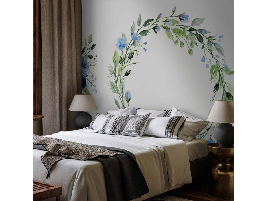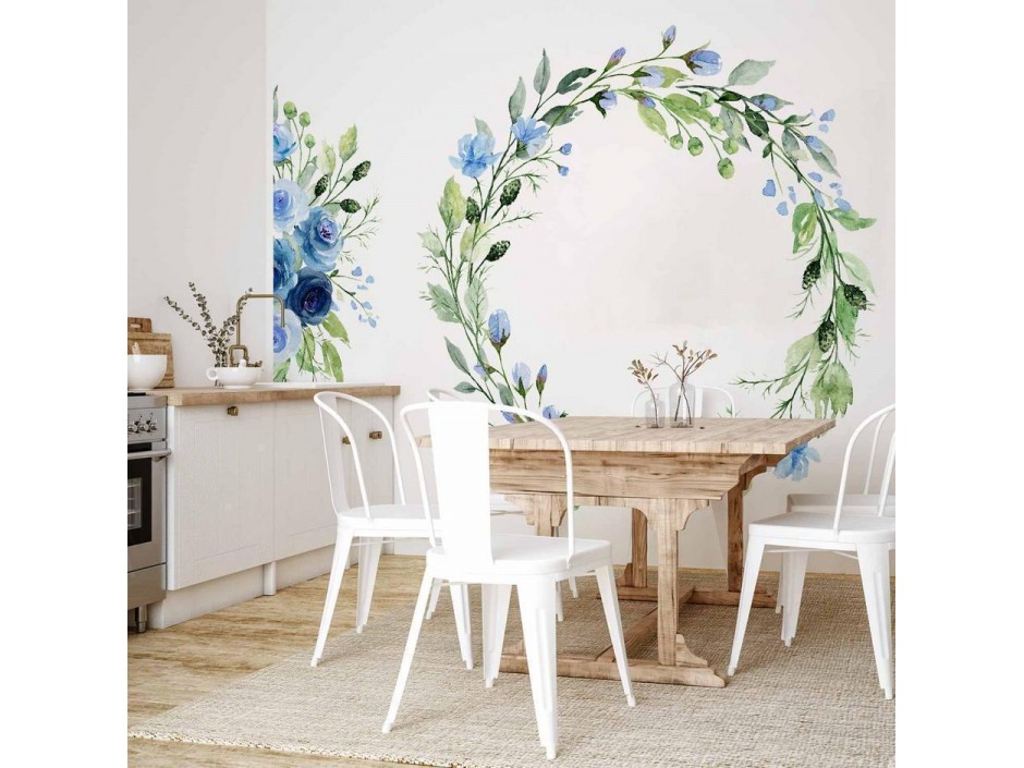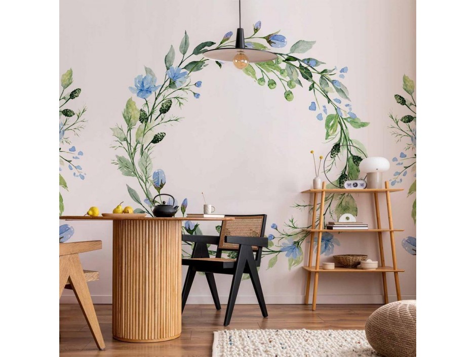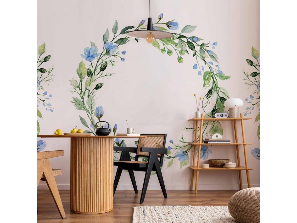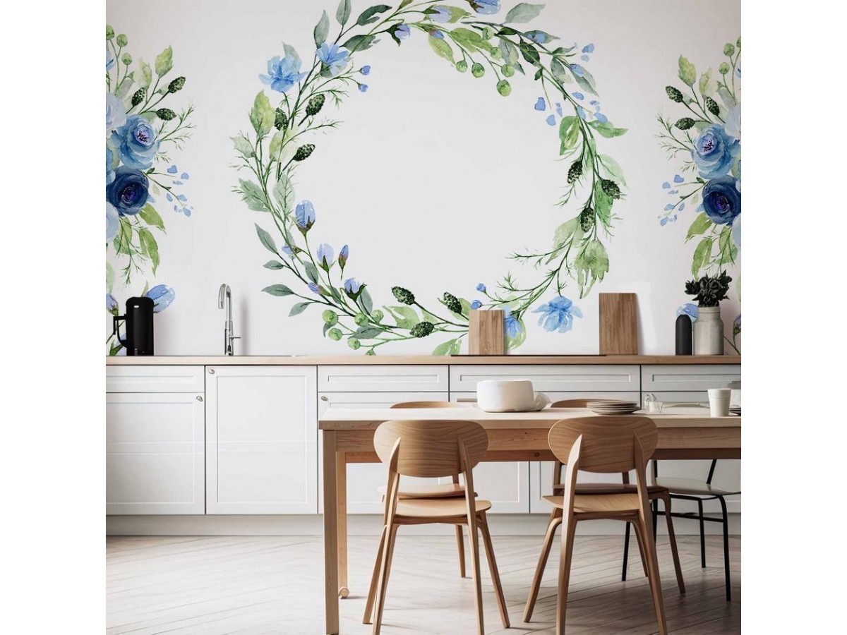 Papier peintUn "Papier peint - Romantic wreath - plant motif with blue flowers and leaves" disponible dans notre offre est une solution simple et rapide pour des personnes qui veulent redonner une nouvelle vie à leur intérieur. En...