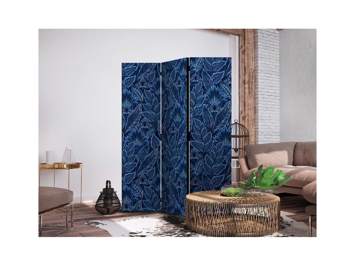 Les paravents décoratifs sont certainement une idée originale dans le domaine de la décoration intérieure. Les paravents remplissent un rôle décoratif, mais aussi bien pratique et fonctionnel. En effet, un paravent intérieur "Paravent - Dense Vegetation - Botanical Patterns in Illustrative Style; Blue" est un meuble formant une cloison amovible et repliable qui peut servir pour délimiter un espace et diviser une grande pièce en deux espaces séparés. Le paravent intérieur est une invention qui est apparue pour la première fois en Chine. Depuis le début de leur existence, les paravents remplissaient des différentes fonctions, comme protéger contre les courants d'air ou bien encore créer un espace isolé pour l'intimité. De nos jours, le paravent intérieur est une belle décoration intérieure, qui permet aussi de gérer l'espace d’une ou de plusieurs pièces selon notre volonté. Le paravent intérieur est également utilisé dans les locaux de service, comme un coiffeur, un cabinet médical ou un bureau comptable pour créer un espace propice à l’intimité ou bien encore à la concentration.