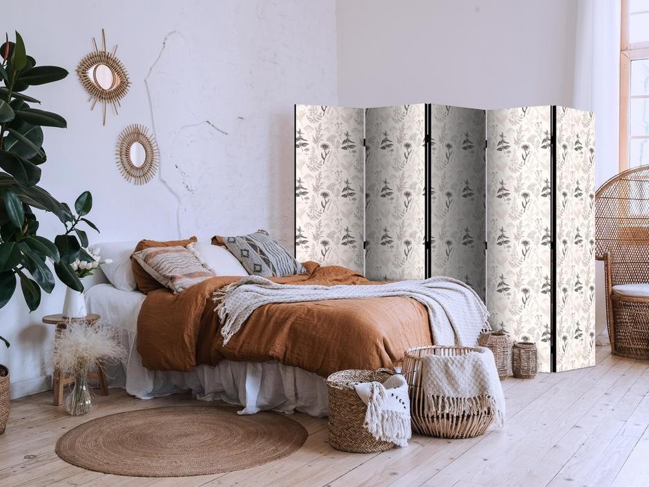 Un paravent décoratif "Paravent - Botanical Illustration - Drawing of Flowers and Herbs - Beige Grays" est composé de panneaux orientables, appelés volets, en bois encadrés d'un châssis de bois et réunis par des charnières. Le paravent décoratif disponible dans notre offre se compose de trois ou de cinq parties. Tous les paravents que nous proposons ont une impression de haute qualité sur l’entoilage qui peut être une belle décoration d'intérieur. L'entoilage d’un paravent déco est tendu sur un cadre en bois solide et léger en même temps. Les panneaux sont finis avec un ruban de satin. Les charnières métalliques sont durables et très solides.Caractéristique technique