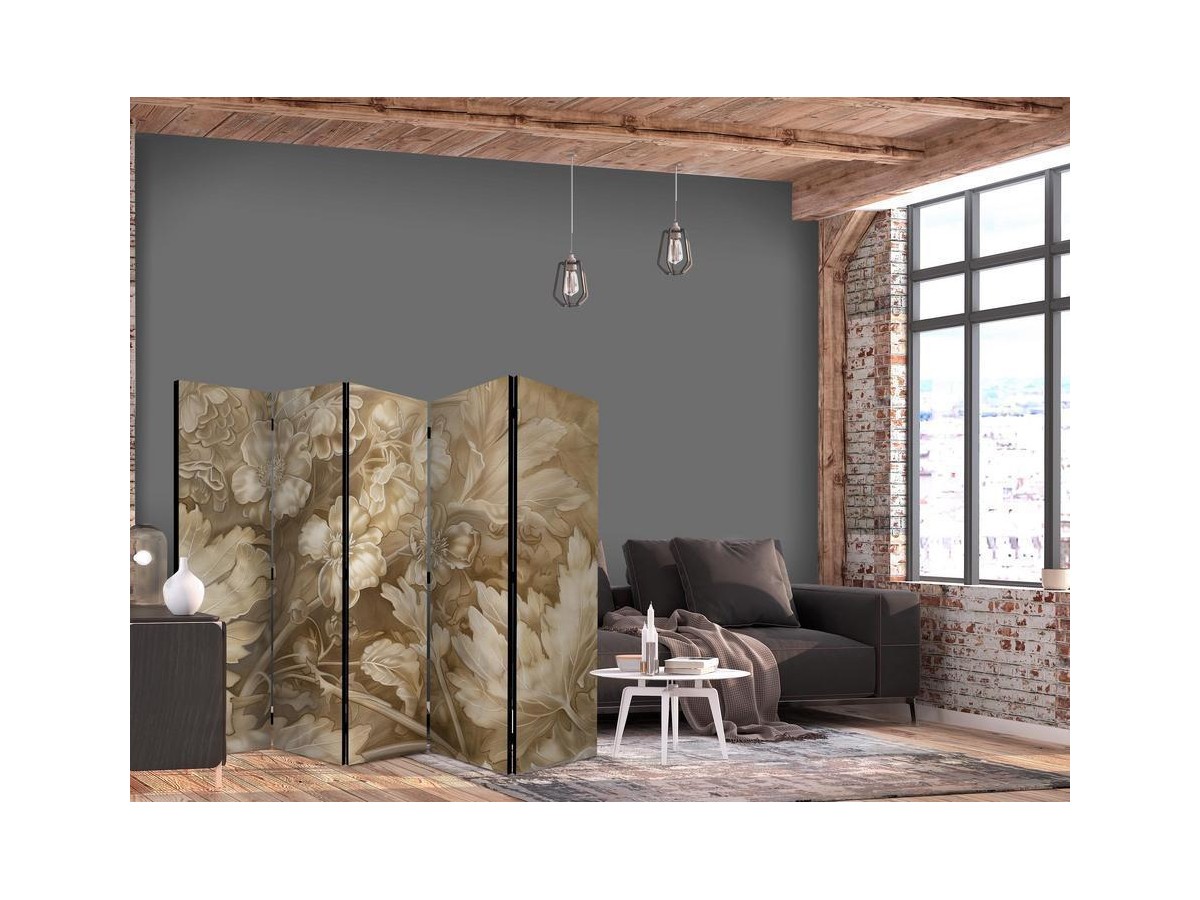 Un paravent décoratif "Paravent - Carved Floral Ornaments in Soft Sepia and Brown Tones" est composé de panneaux orientables, appelés volets, en bois encadrés d'un châssis de bois et réunis par des charnières. Le paravent décoratif disponible dans notre offre se compose de trois ou de cinq parties. Tous les paravents que nous proposons ont une impression de haute qualité sur l’entoilage qui peut être une belle décoration d'intérieur. L'entoilage d’un paravent déco est tendu sur un cadre en bois solide et léger en même temps. Les panneaux sont finis avec un ruban de satin. Les charnières métalliques sont durables et très solides.Caractéristique technique