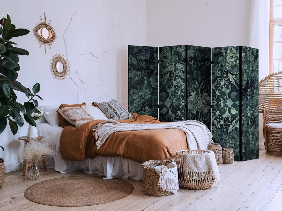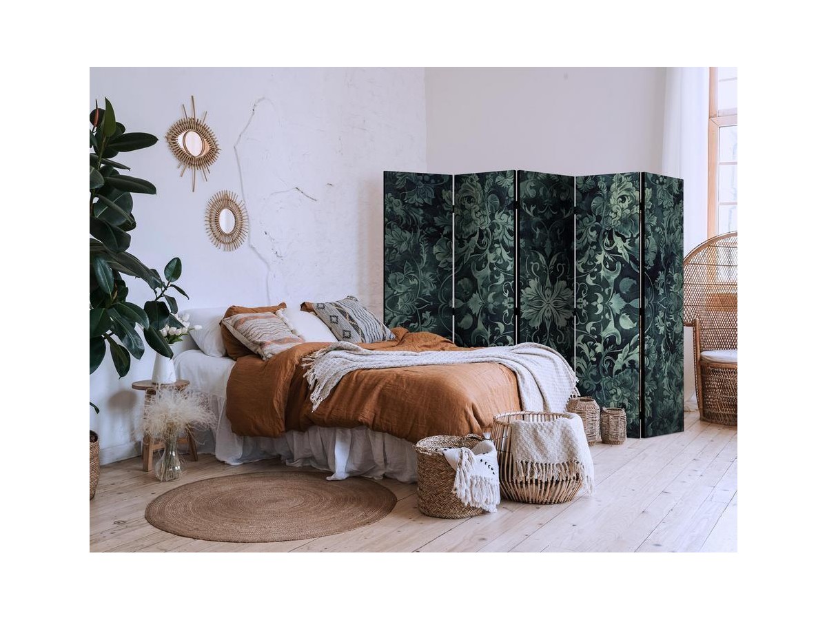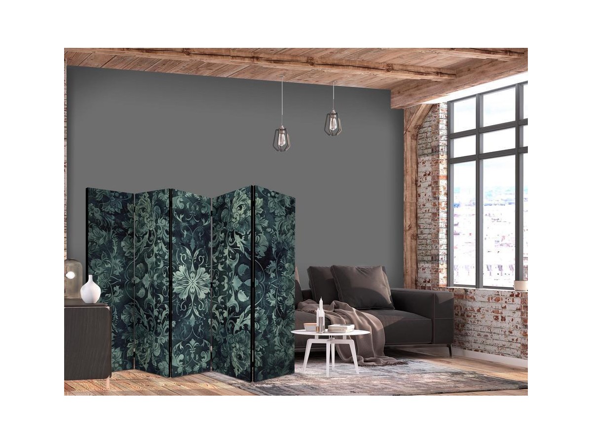 Un paravent décoratif "Paravent - Oriental Carpet Pattern - Emerald Ornaments and Rubbed Patterns" est composé de panneaux orientables, appelés volets, en bois encadrés d'un châssis de bois et réunis par des charnières. Le paravent décoratif disponible dans notre offre se compose de trois ou de cinq parties. Tous les paravents que nous proposons ont une impression de haute qualité sur l’entoilage qui peut être une belle décoration d'intérieur. L'entoilage d’un paravent déco est tendu sur un cadre en bois solide et léger en même temps. Les panneaux sont finis avec un ruban de satin. Les charnières métalliques sont durables et très solides.Caractéristique technique