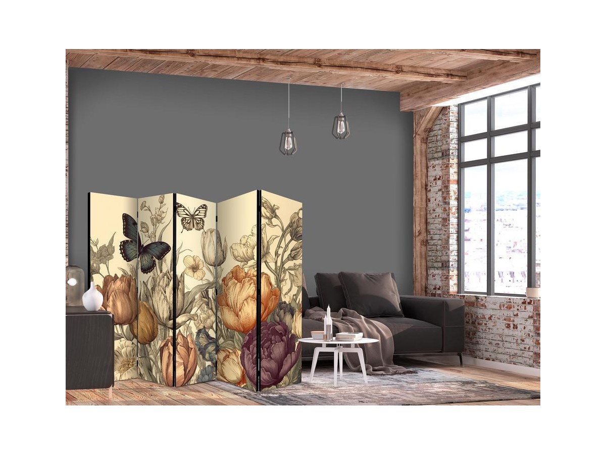 Paravent intérieur "Paravent - Tulips in Cream - Illustration of Flowers and Butterflies on a Light Background"Les paravents décoratifs sont certainement une idée originale dans le domaine de la décoration intérieure. Les paravents...