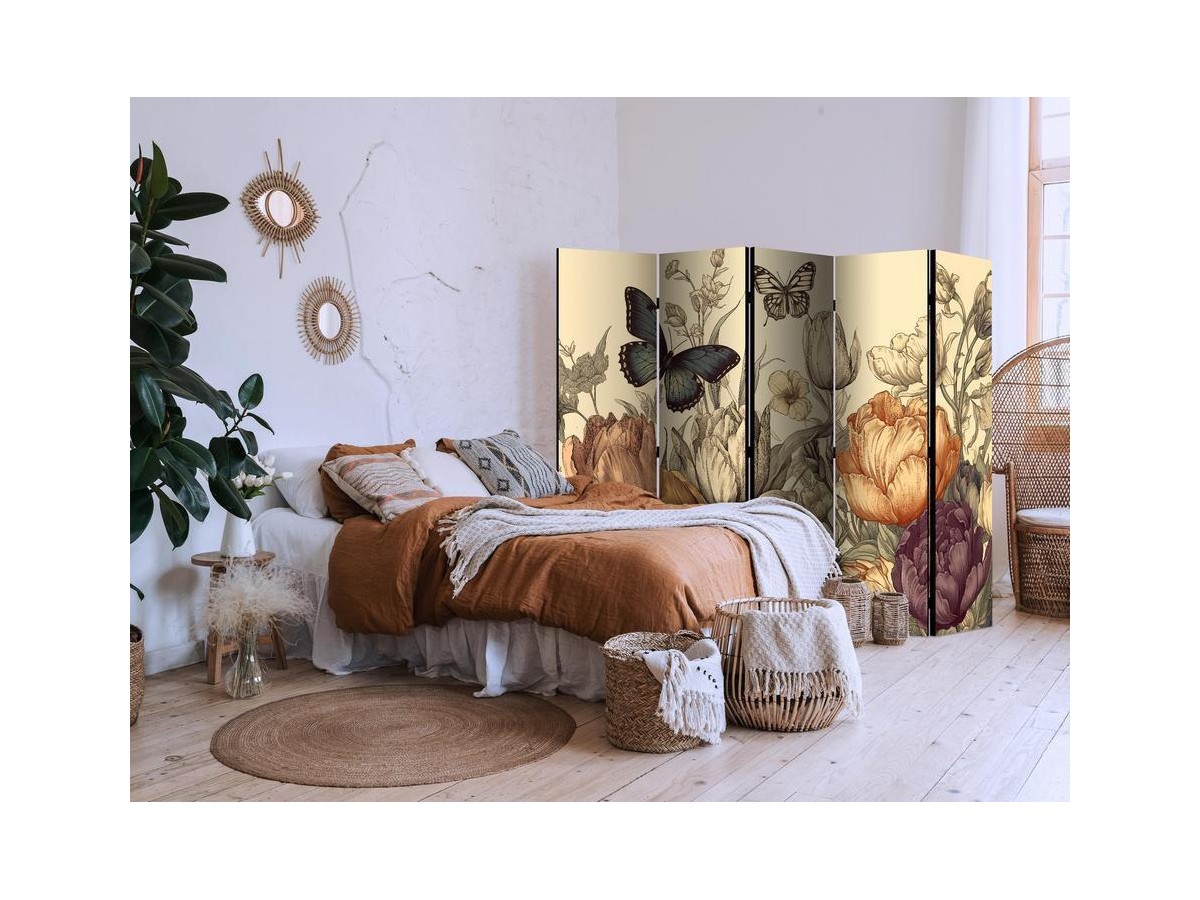 Un paravent décoratif "Paravent - Tulips in Cream - Illustration of Flowers and Butterflies on a Light Background" est composé de panneaux orientables, appelés volets, en bois encadrés d'un châssis de bois et réunis par des charnières. Le paravent décoratif disponible dans notre offre se compose de trois ou de cinq parties. Tous les paravents que nous proposons ont une impression de haute qualité sur l’entoilage qui peut être une belle décoration d'intérieur. L'entoilage d’un paravent déco est tendu sur un cadre en bois solide et léger en même temps. Les panneaux sont finis avec un ruban de satin. Les charnières métalliques sont durables et très solides.Caractéristique technique