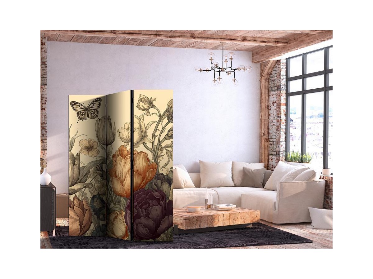 Les paravents décoratifs sont certainement une idée originale dans le domaine de la décoration intérieure. Les paravents remplissent un rôle décoratif, mais aussi bien pratique et fonctionnel. En effet, un paravent intérieur "Paravent - Tulips in Cream - Illustration of Flowers and Butterflies on a Light Background" est un meuble formant une cloison amovible et repliable qui peut servir pour délimiter un espace et diviser une grande pièce en deux espaces séparés. Le paravent intérieur est une invention qui est apparue pour la première fois en Chine. Depuis le début de leur existence, les paravents remplissaient des différentes fonctions, comme protéger contre les courants d'air ou bien encore créer un espace isolé pour l'intimité. De nos jours, le paravent intérieur est une belle décoration intérieure, qui permet aussi de gérer l'espace d’une ou de plusieurs pièces selon notre volonté. Le paravent intérieur est également utilisé dans les locaux de service, comme un coiffeur, un cabinet médical ou un bureau comptable pour créer un espace propice à l’intimité ou bien encore à la concentration.