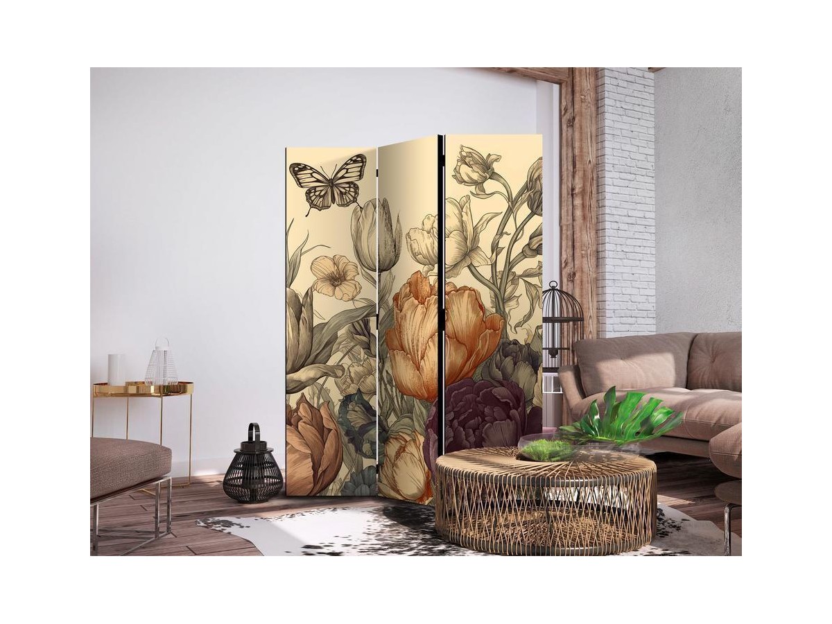 Paravent intérieur "Paravent - Tulips in Cream - Illustration of Flowers and Butterflies on a Light Background"Les paravents décoratifs sont certainement une idée originale dans le domaine de la décoration intérieure. Les paravents...