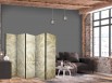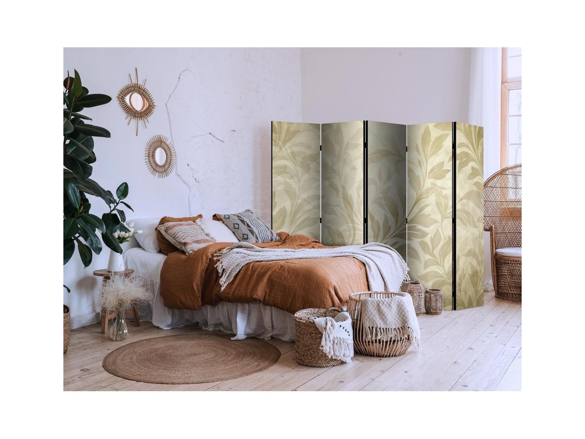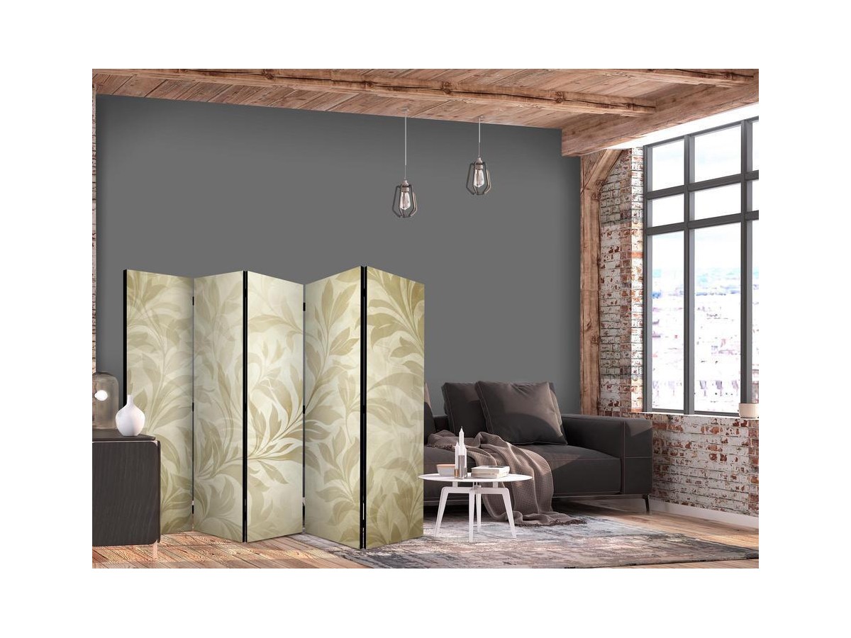 Un paravent décoratif "Paravent - Botanical Motif with Leaves and Vines in Sandy Colors." est composé de panneaux orientables, appelés volets, en bois encadrés d'un châssis de bois et réunis par des charnières. Le paravent décoratif disponible dans notre offre se compose de trois ou de cinq parties. Tous les paravents que nous proposons ont une impression de haute qualité sur l’entoilage qui peut être une belle décoration d'intérieur. L'entoilage d’un paravent déco est tendu sur un cadre en bois solide et léger en même temps. Les panneaux sont finis avec un ruban de satin. Les charnières métalliques sont durables et très solides.Caractéristique technique