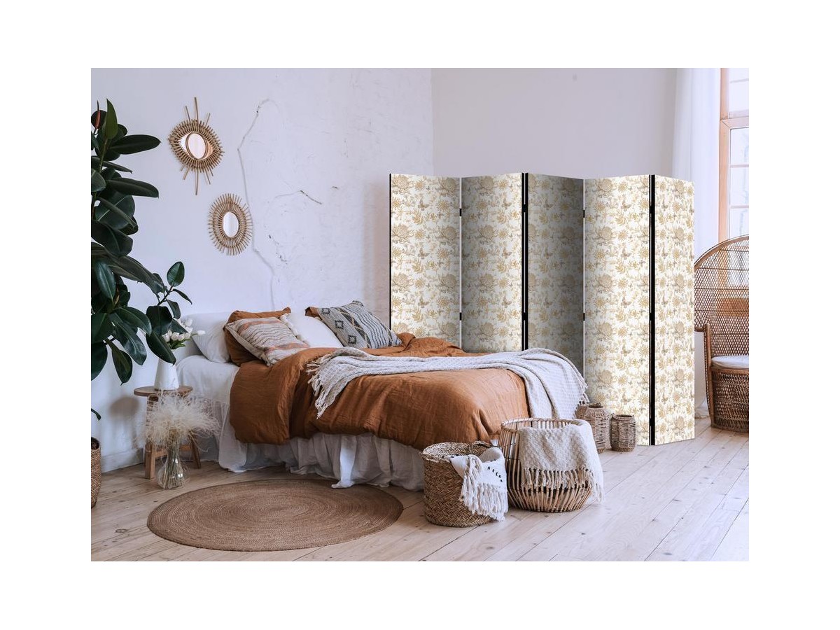 Un paravent décoratif "Paravent - Beige Shades of Nature - Flowers and Butterflies on a White Background - Illustration" est composé de panneaux orientables, appelés volets, en bois encadrés d'un châssis de bois et réunis par des charnières. Le paravent décoratif disponible dans notre offre se compose de trois ou de cinq parties. Tous les paravents que nous proposons ont une impression de haute qualité sur l’entoilage qui peut être une belle décoration d'intérieur. L'entoilage d’un paravent déco est tendu sur un cadre en bois solide et léger en même temps. Les panneaux sont finis avec un ruban de satin. Les charnières métalliques sont durables et très solides.Caractéristique technique