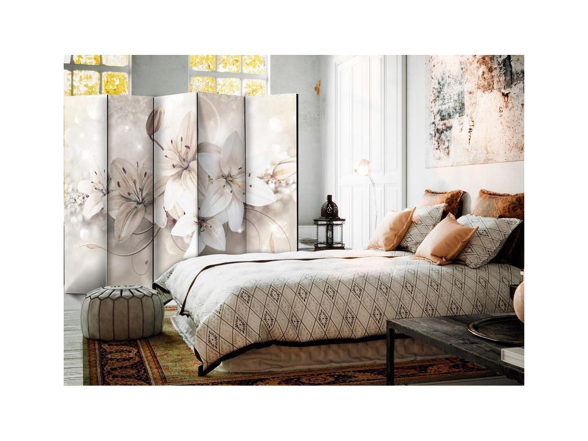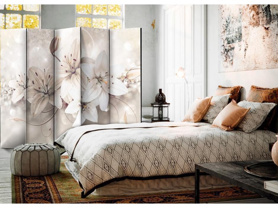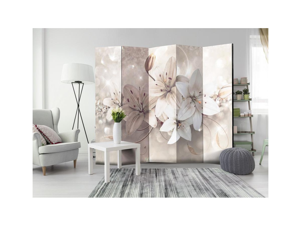 Les paravents décoratifs sont certainement une idée originale dans le domaine de la décoration intérieure. Les paravents remplissent un rôle décoratif, mais aussi bien pratique et fonctionnel. En effet, un paravent intérieur "Paravent - Diamond Lilies II" est un meuble formant une cloison amovible et repliable qui peut servir pour délimiter un espace et diviser une grande pièce en deux espaces séparés. Le paravent intérieur est une invention qui est apparue pour la première fois en Chine. Depuis le début de leur existence, les paravents remplissaient des différentes fonctions, comme protéger contre les courants d'air ou bien encore créer un espace isolé pour l'intimité. De nos jours, le paravent intérieur est une belle décoration intérieure, qui permet aussi de gérer l'espace d’une ou de plusieurs pièces selon notre volonté. Le paravent intérieur est également utilisé dans les locaux de service, comme un coiffeur, un cabinet médical ou un bureau comptable pour créer un espace propice à l’intimité ou bien encore à la concentration.