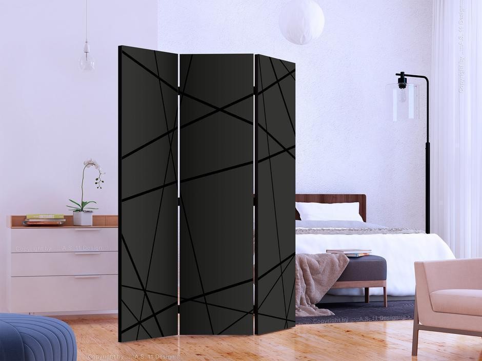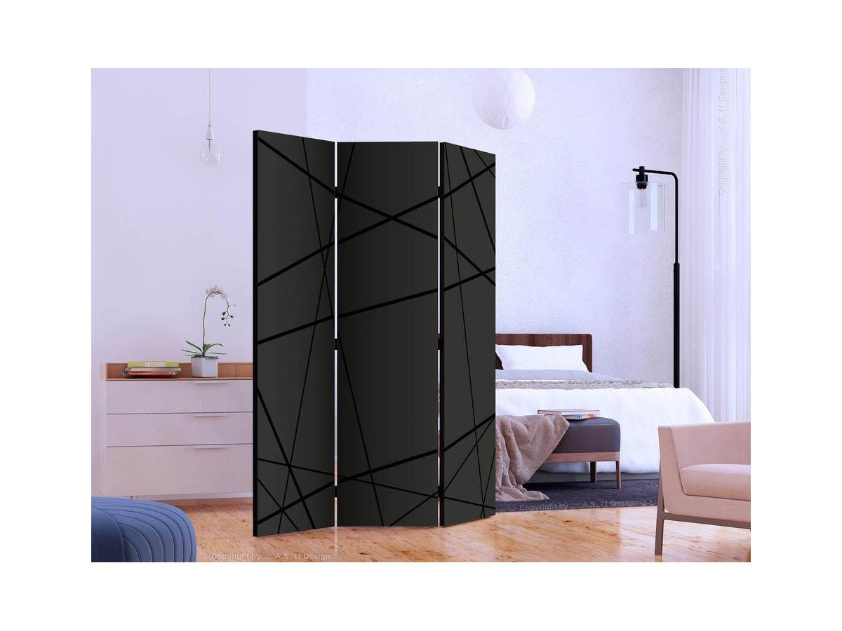 Les paravents décoratifs sont certainement une idée originale dans le domaine de la décoration intérieure. Les paravents remplissent un rôle décoratif, mais aussi bien pratique et fonctionnel. En effet, un paravent intérieur "Paravent - Dark Intersection" est un meuble formant une cloison amovible et repliable qui peut servir pour délimiter un espace et diviser une grande pièce en deux espaces séparés. Le paravent intérieur est une invention qui est apparue pour la première fois en Chine. Depuis le début de leur existence, les paravents remplissaient des différentes fonctions, comme protéger contre les courants d'air ou bien encore créer un espace isolé pour l'intimité. De nos jours, le paravent intérieur est une belle décoration intérieure, qui permet aussi de gérer l'espace d’une ou de plusieurs pièces selon notre volonté. Le paravent intérieur est également utilisé dans les locaux de service, comme un coiffeur, un cabinet médical ou un bureau comptable pour créer un espace propice à l’intimité ou bien encore à la concentration.